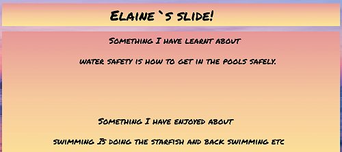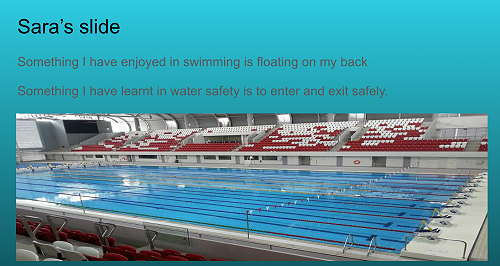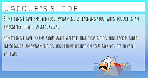 This week the students were swimming on Monday and Wednesday as per the next few weeks too. They were learning key pool safety like how to enter and exit the water. In the pool the students were learning to scull water, lye in the water and then worked on swimming on their back, by only using their legs and feet for propulsion.