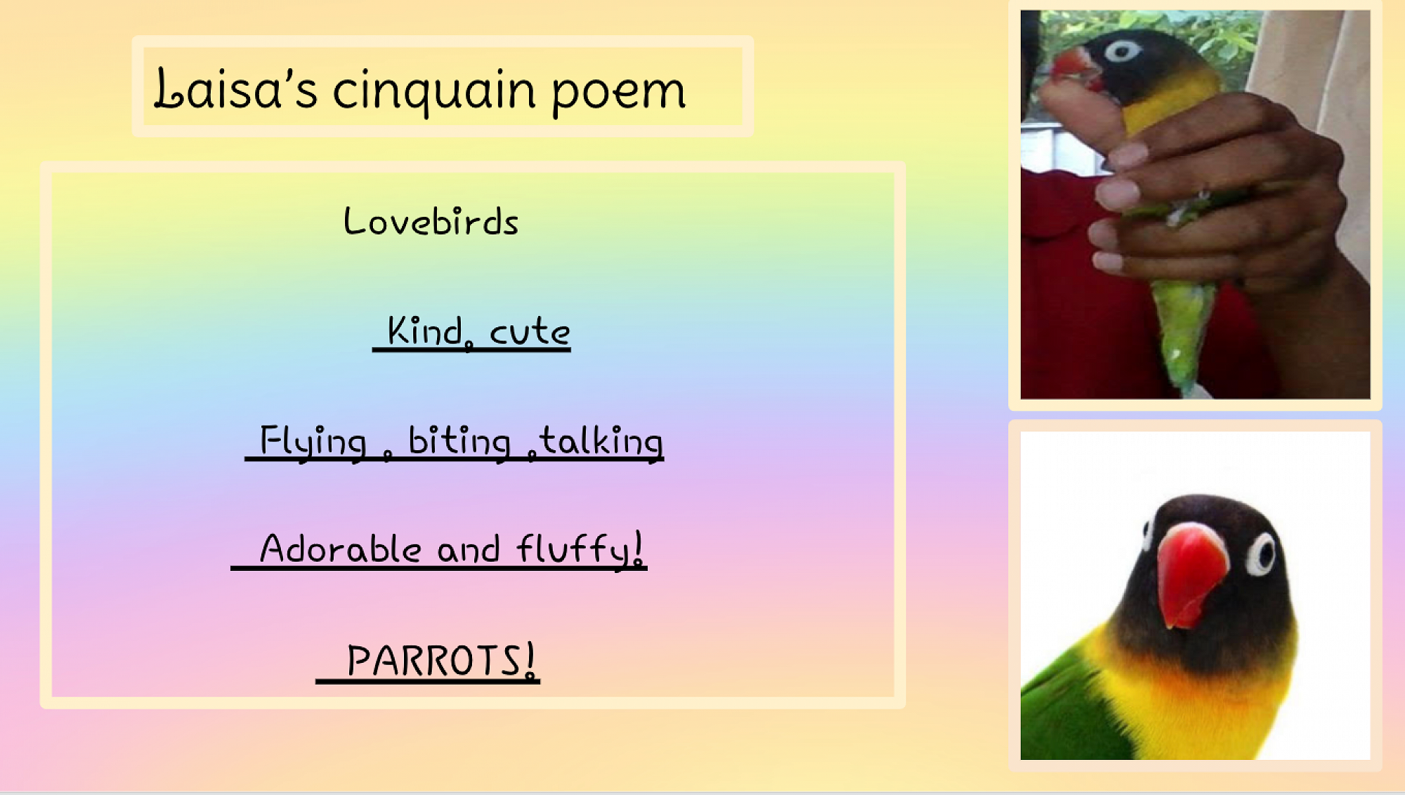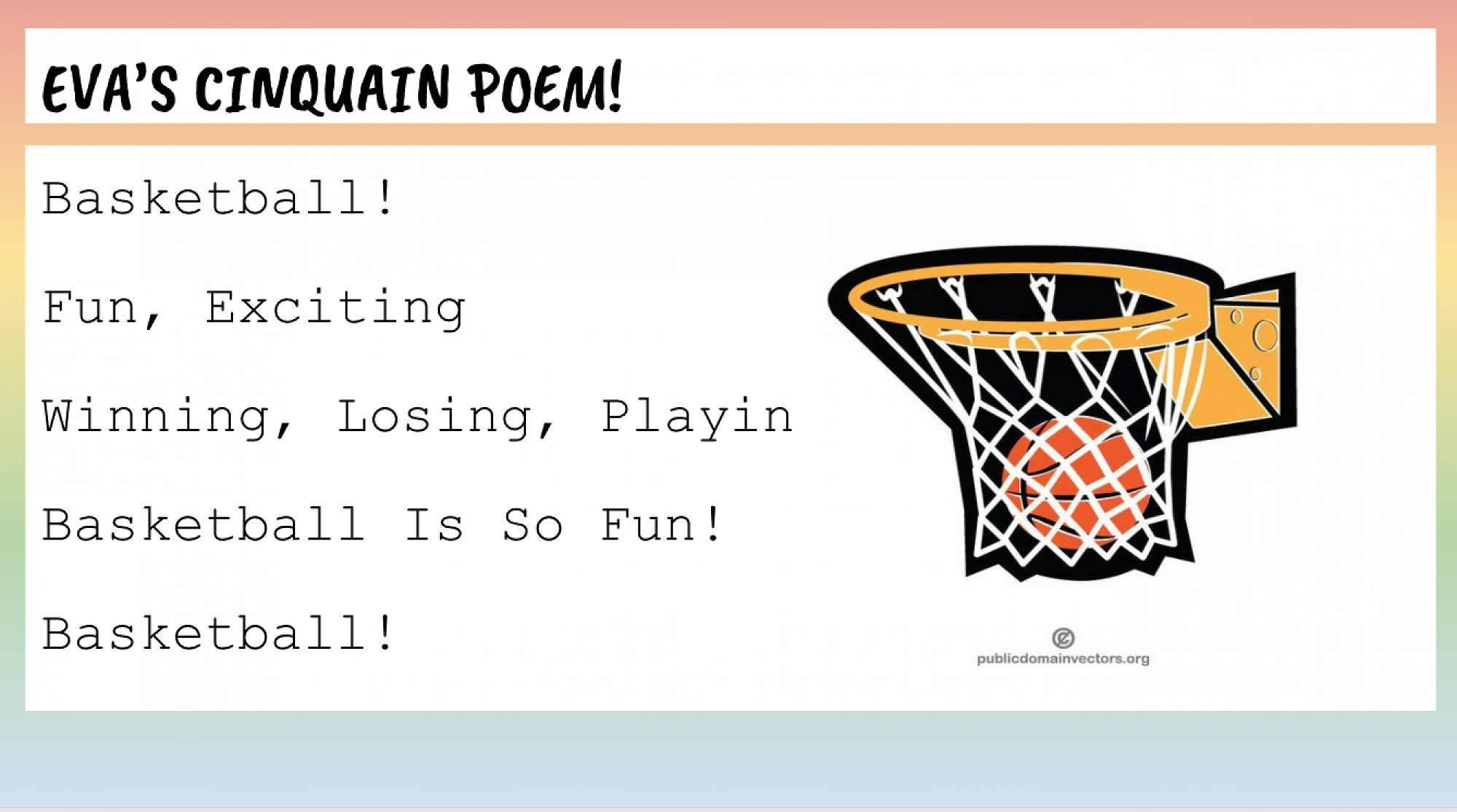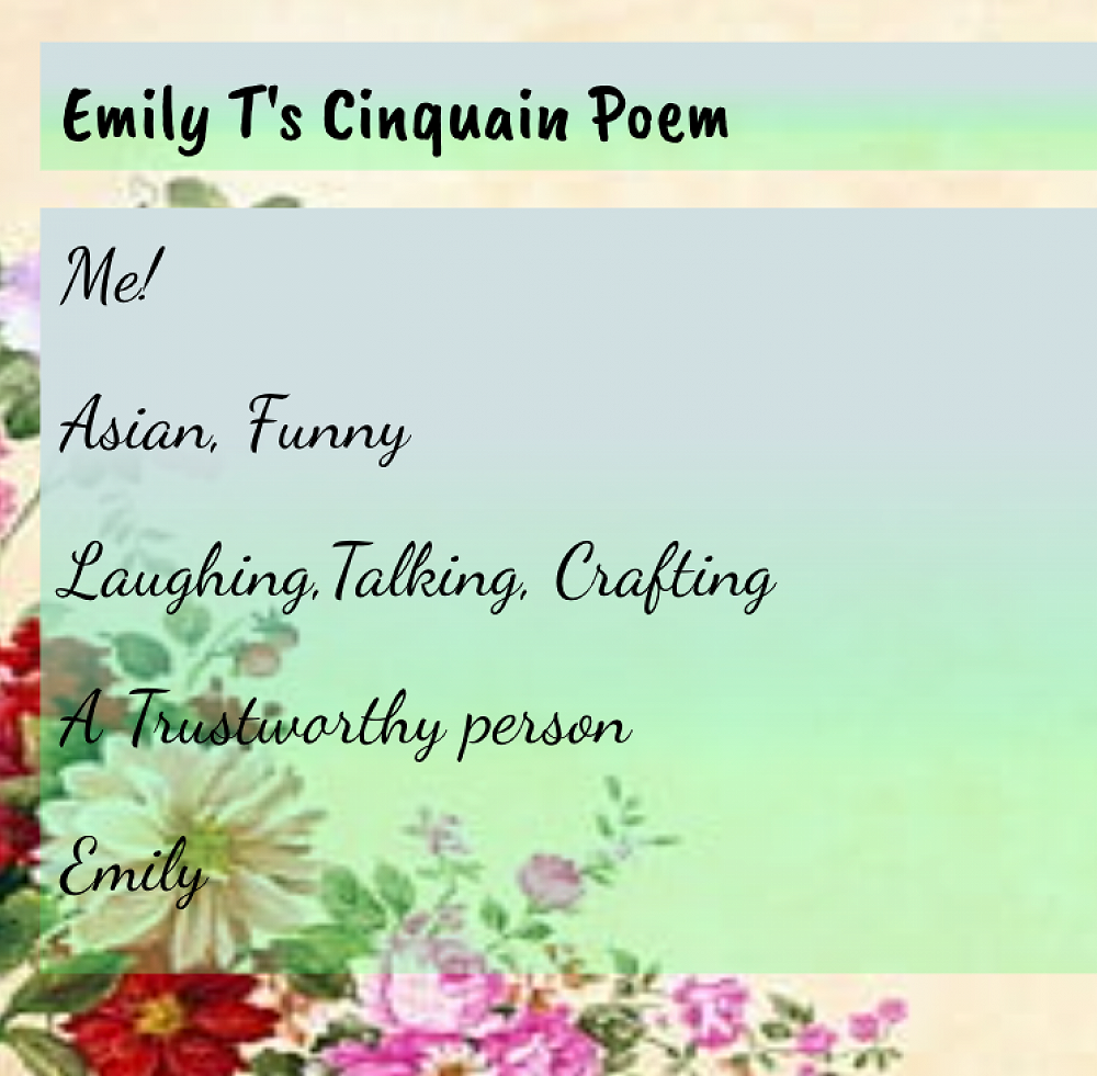 The Iwi group were learning about the language and structure of a Cinquain poem. They looked at a range of examples and then wrote a collection of their own. Here are some examples of students published writing.
