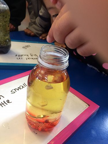 If we switched the amount of oil/water so they were the other way around the bubbles created were smaller and only at the very top of the bottle.