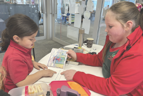 Every day, there are many students out during lunch Read and Feed reading with the juniors, this is what goes on during buddy reading.