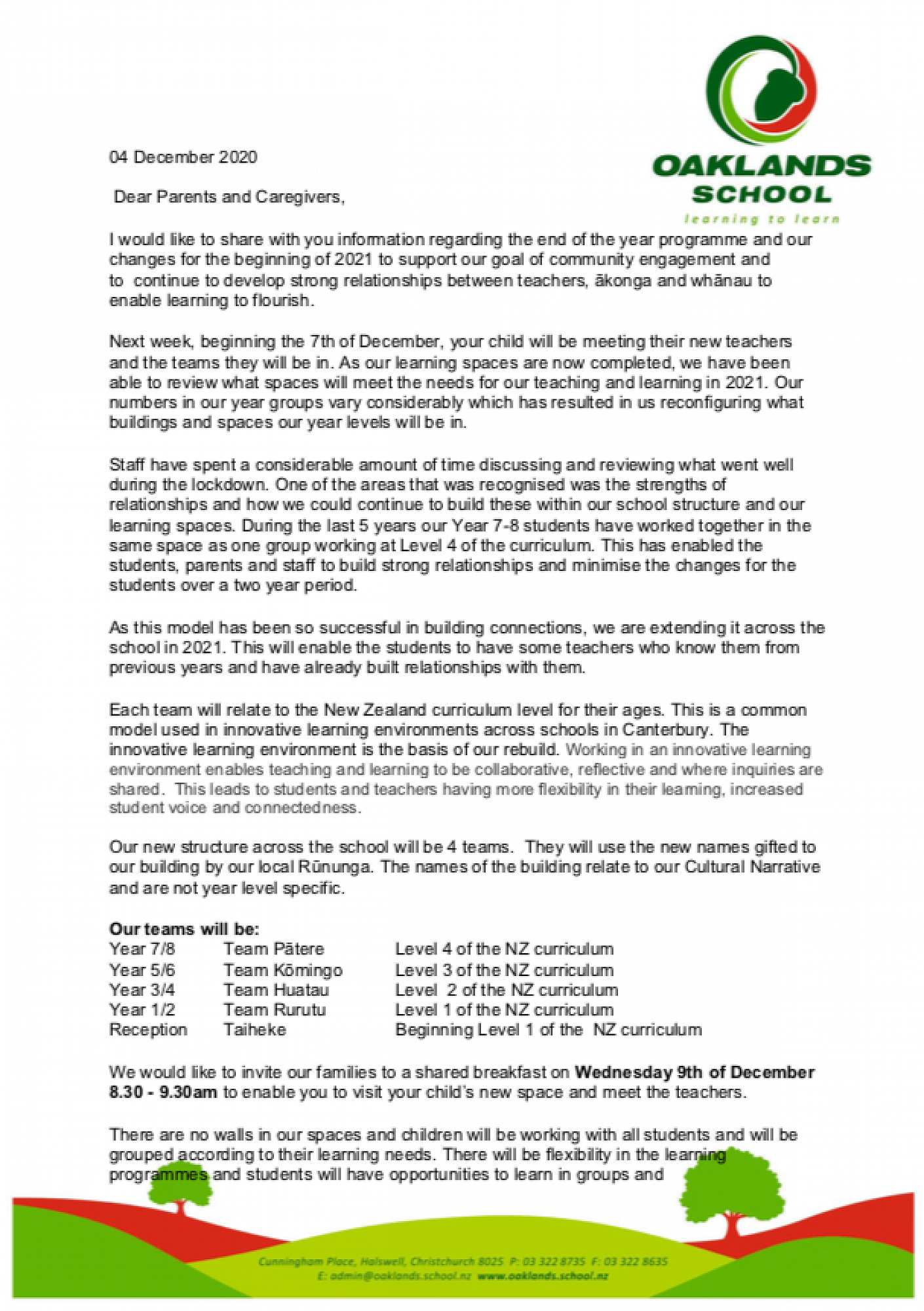 All students and their whanau are invited to come to a shared breakfast with the teachers who will be teaching them next year. Bring a plate and come to the. new space for next year- Huatau.