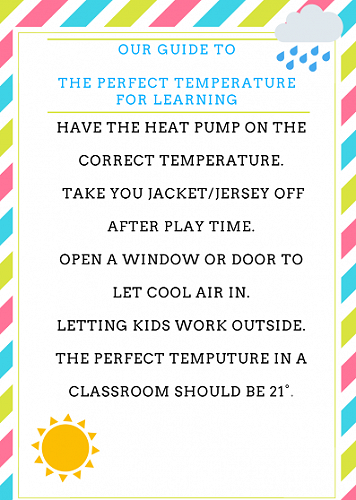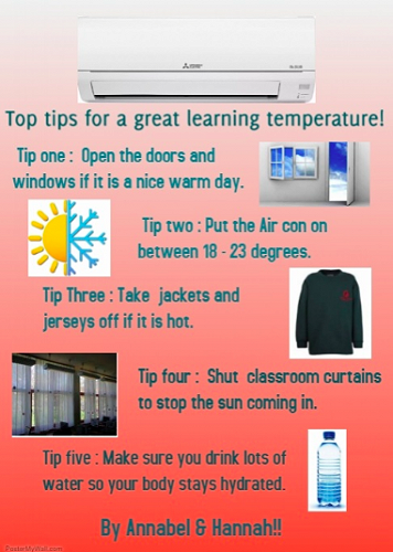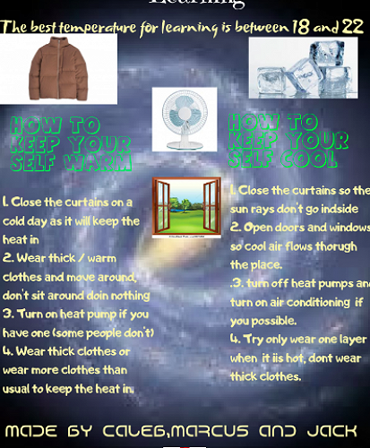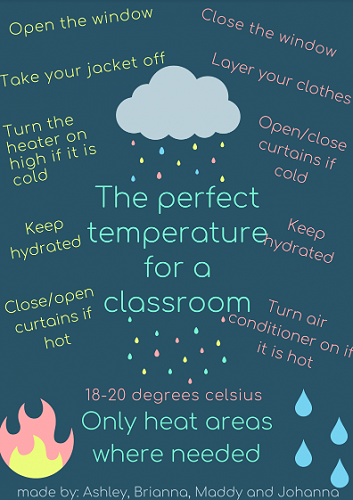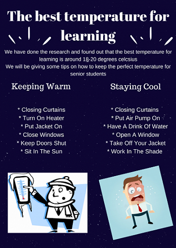 The aim was to produce a resource that provides information and tips for their target audience to use to achieve the perfect temperature for learning. Students created a variety of posters that will be displayed around the school to support other students in making positive decisions to achieve the perfect temperature for learning.