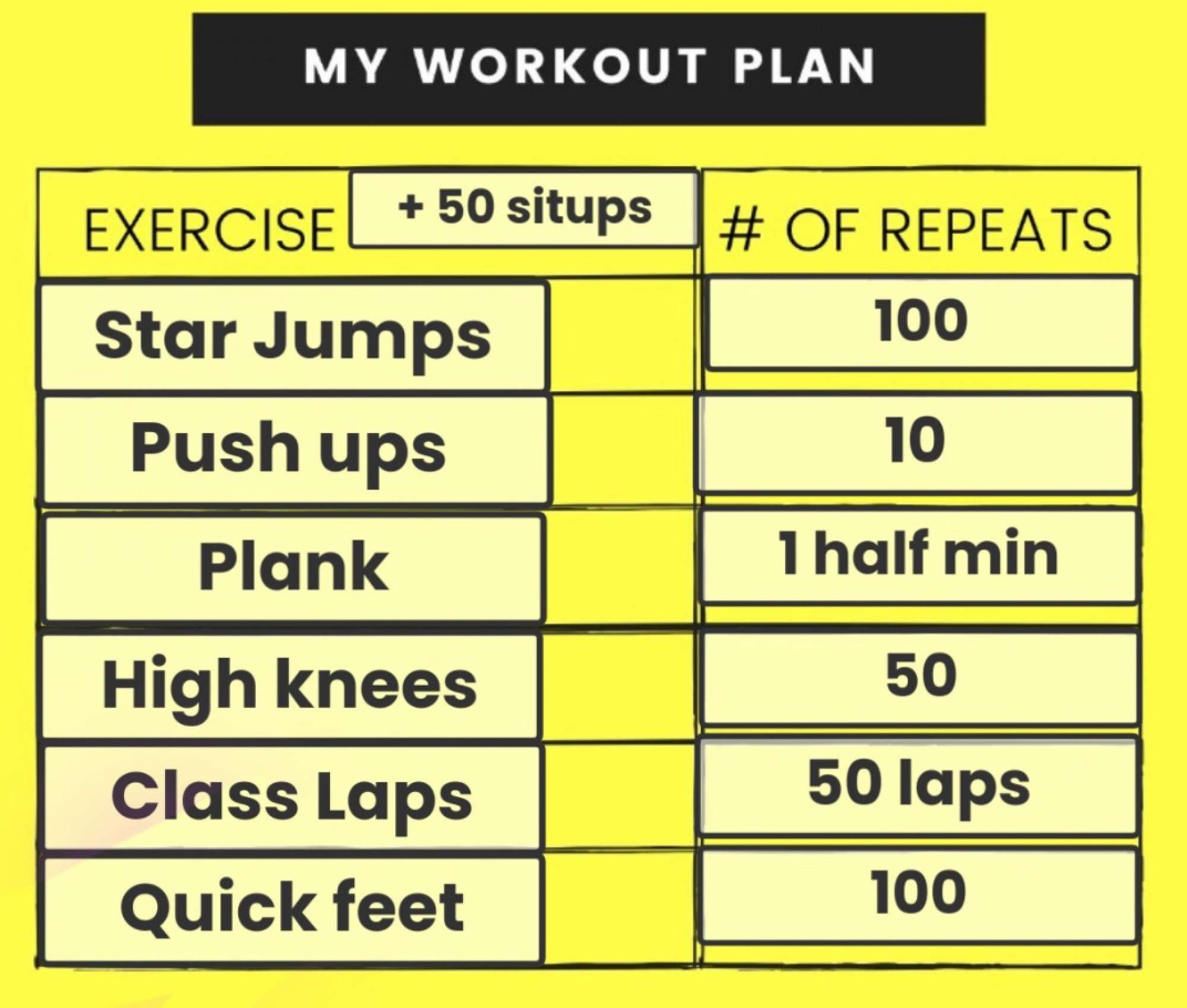 Here is an example of one student's plan and some photos of them trying out their fitness plans.