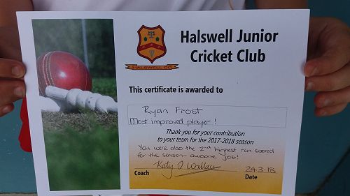 This year Ryan played for Team 19 at the Halswell Cricket Club. After a steller season Ryan received the award for 'Most Improved Player' for his team at the recent prize giving.