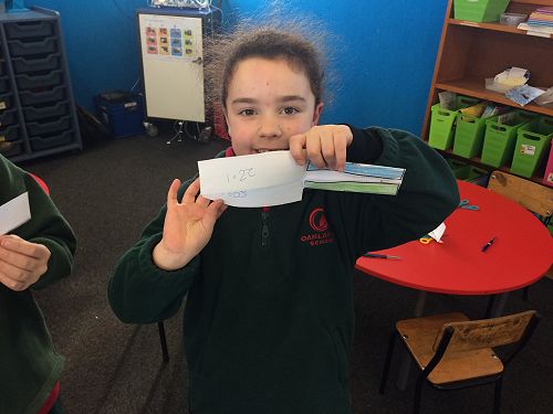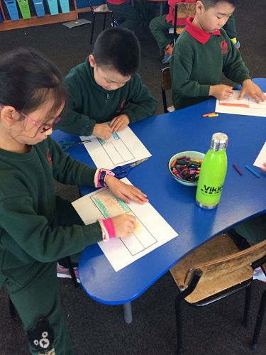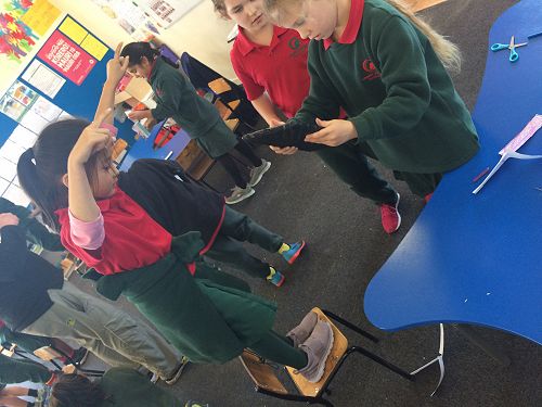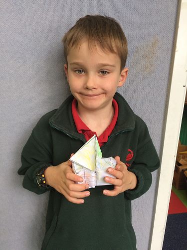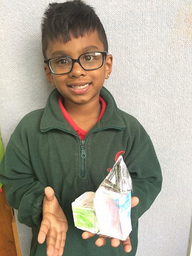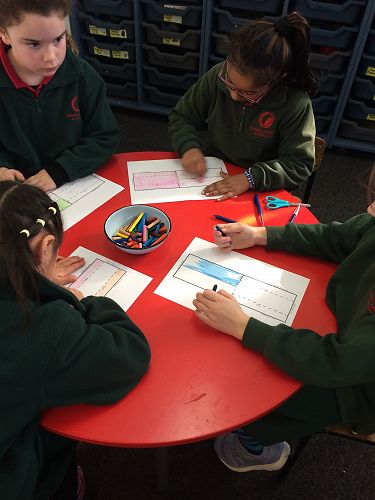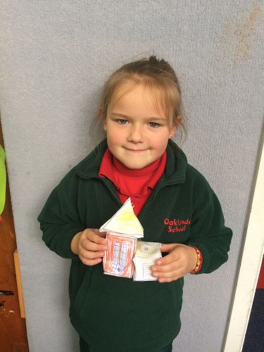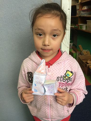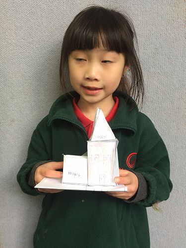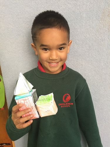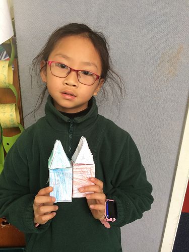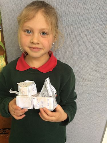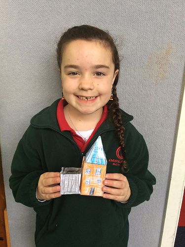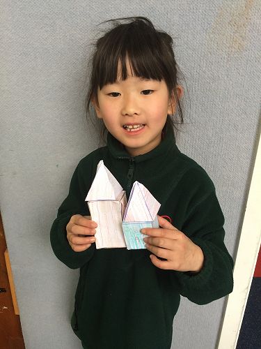 We have been learning about 3D shapes in Geometry. We made 3D shapes with paper nets then used them to build houses and other buildings.