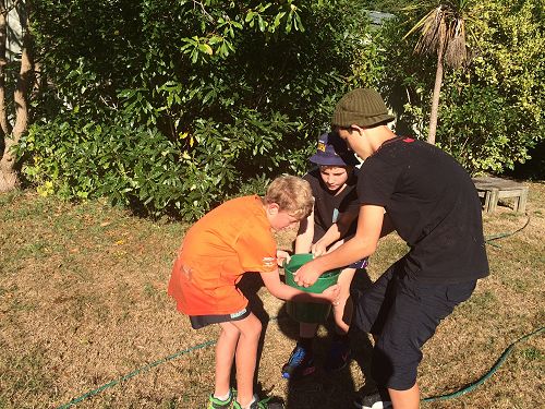 At Cooperative Games the first activity involved groups of three trying to hit cups filled with water using sports equipment and grass skis. The next activity was an obstacle course that involved taking a bucket of water around Wainui and the group with the most water at the finish line won. The final activity was a free-for-all water fight.