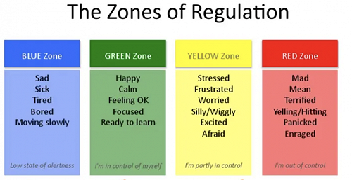 The Zones of Regulation uses four colors to help children self-identify how they’re feeling and categorise it based on colour.