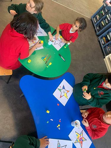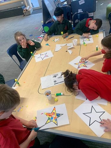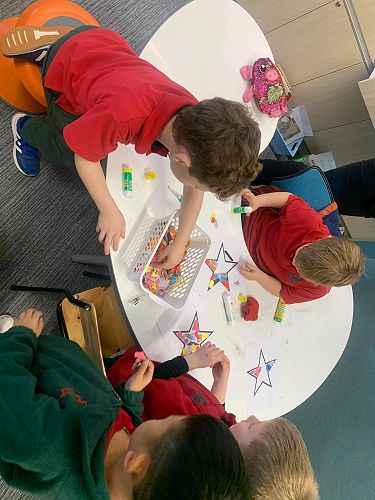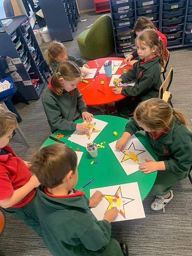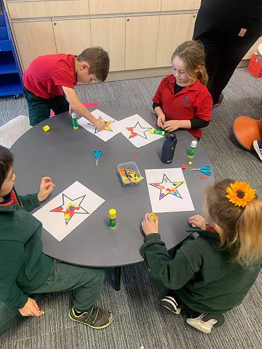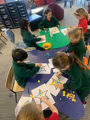 We have some beautiful Matariki stars made with colourful collage as our community art project, come and see these displayed in our window.