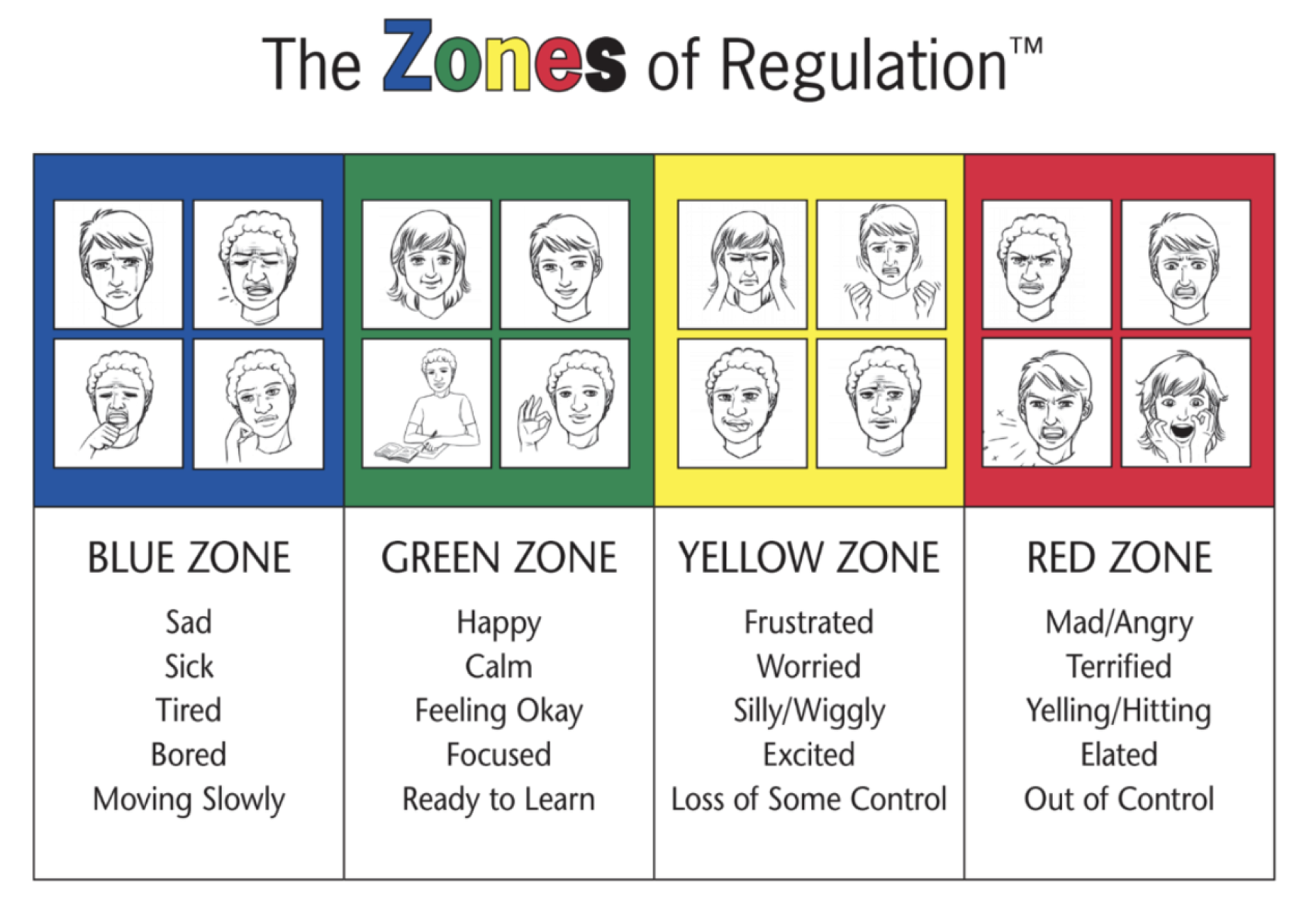The Zones categorise all the different ways we feel and the states of alertness we experience into four concrete coloured zones (blue, green, yellow and red). We use these four zones to describe and understand how our brain and body feels. Zones framework provides strategies to teach all students to become more aware of and independent in controlling their emotions and impulses, manage their sensory needs, and improve their ability to problem solve conflicts. It allows students to build their capacity for resilience and their ability to self-regulate' their emotions when things go wrong.