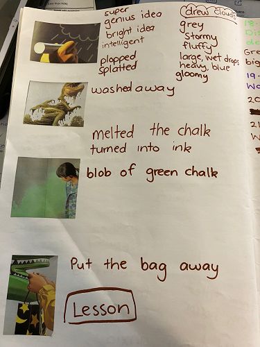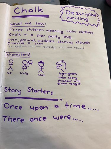 We watched the silent story 'Chalk' and brainstormed ways we could describe the story. We watched it in sections and used pictures from the story to help us remember what happened.