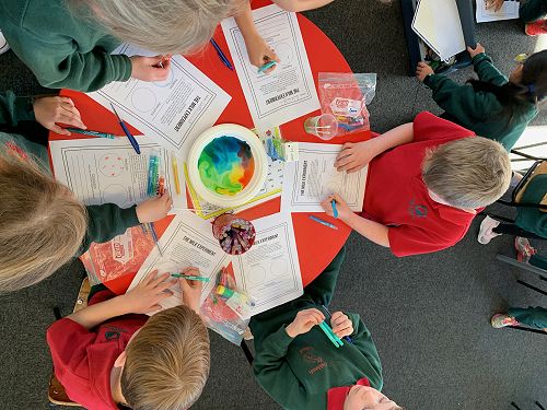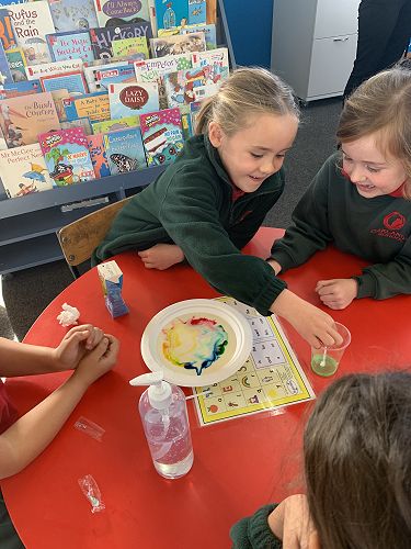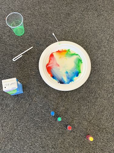 As our writing hook, we completed another awesome experiment this time we used milk and food colouring and watched as the colours separated all over the plate when we dipped in dishwashing liquid.