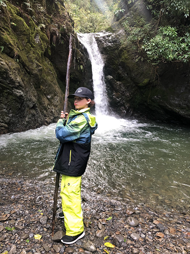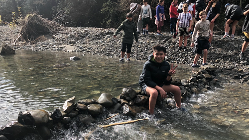 Nature walk - Mr. Brown took the group down the steps, down some more steps (first keyword from camp: STEPS), and finally to the river. Unknown to many children, parents, and teachers (Miss Booth), when Mr. Brown says we're doing a "river walk" he doesn't actually mean we're walking to or along a river, he means through the river. A few surprised faces and some extremely wet shoes later we made our way winding up the river towards a waterfall. This provided students with a perfect opportunity to observe the interaction of the hydrosphere and the geosphere. We discussed the change in the landscape due to recent flooding and the power of the hydrosphere.