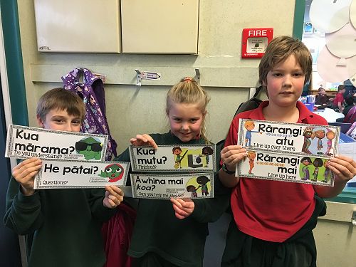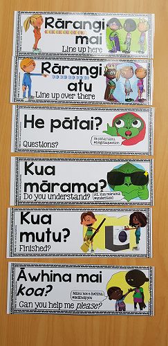 [2] Everyday classroom phrases (sit down, coe to the mat, pass the pen, open the door, well done, any questions, do you understand, what is this, how do you say … in Māori/English etc)