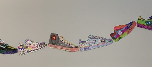 We have been busy putting our personality into our shoe art. Each student has a shoe that represents themselves through colour choice, design, illustrations and shoe outline. Shoes are 'walking' around the room, please feel welcome to come and have a look.