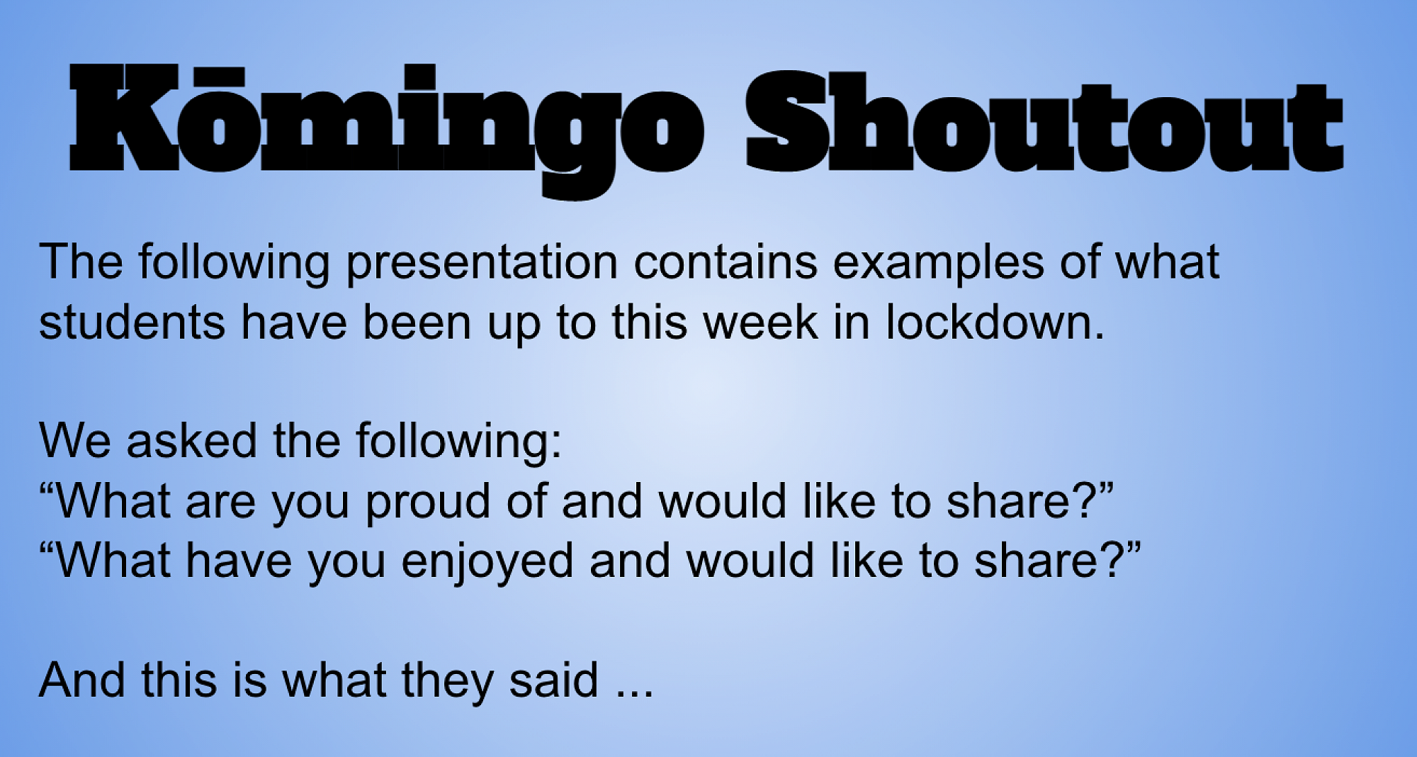 This slide, shared with families and students is where you can access the timetable and links to zoom meetings and resources for distance learning. As it is in 'publish to the web' form, it needs to be refreshed regularly in order for updates to be viewable. Please let us know if you need any help with this.