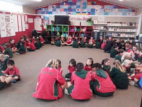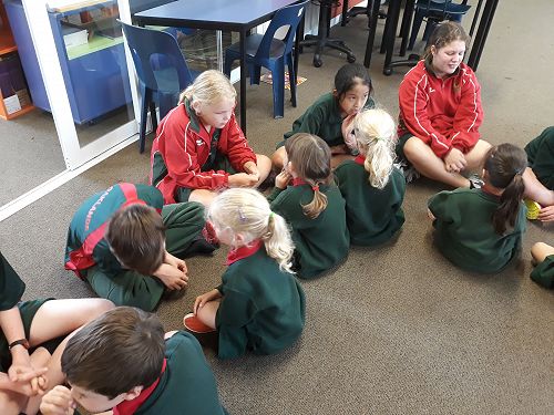 The Year 7/8 students are working with the Year 0/1 students in the buddy programme.