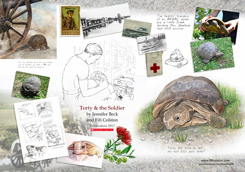 The story is of a New Zealander, Stewart Little, who went to war in the medical field. He found a tortoise in Greece, which got run over by a gun cart right in front of him! Stewart took care of Torty and eventually brought her back to New Zealand on a hospital ship, the Marama. Torty was estimated to be approximately 100 years old when Stewart found her, she has since been cared for by his family here in New Zealand. Amazingly, Torty is still alive and is the oldest living WW1 veteran in New Zealand.