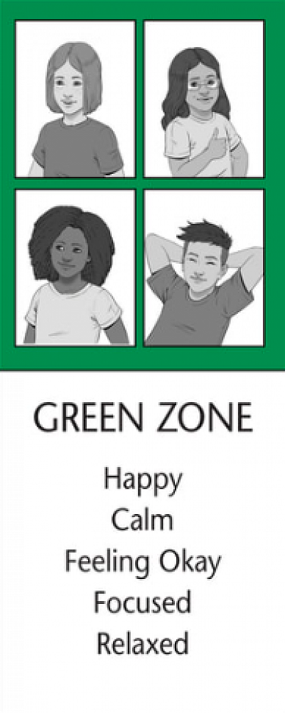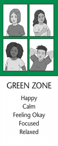 The Green Zone is used to describe a regulated state of alertness. A person may be described as calm, happy, focused, or content when in the Green Zone. This is the Zone students generally need to be in for successful learning and for positive social interactions. Being in the Green Zone shows control.