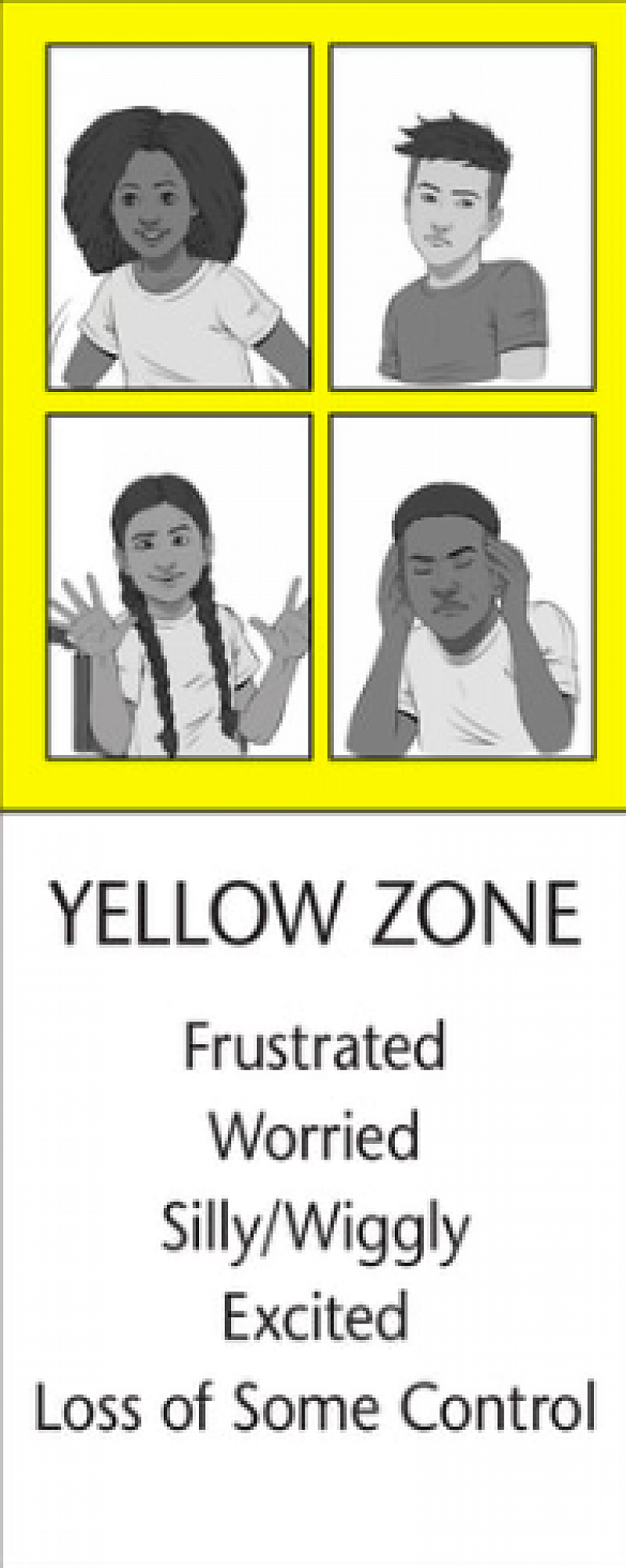 The Yellow Zone is used to describe a heightened state of alertness. A person may be experiencing feelings such as stress, frustration, anxiety, excitement, silliness, nervousness, confusion and other slightly elevated emotions (wiggly, squirmy etc). The Yellow Zone is starting to lose some control.