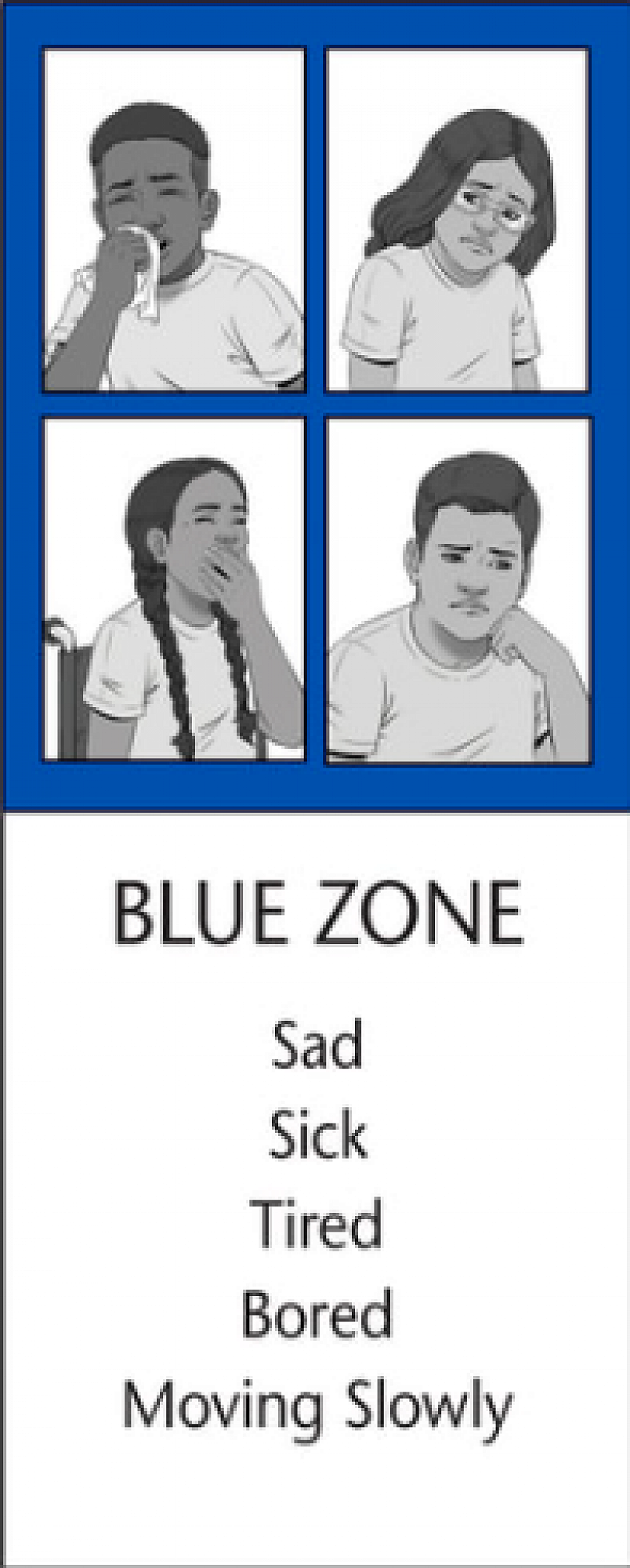 The Blue Zone is used to describe low states of alertness, such as when one feels sad, sick or bored. This is when one's body and/or brain is moving slowly or sluggishly.