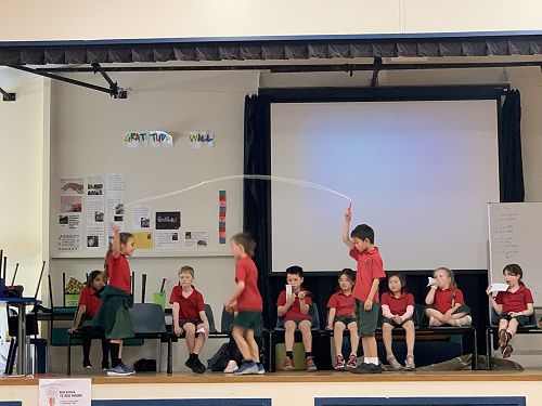 Dhruti - Cricket coaching session, skipping on the stage at Kakano Assembly, Junior Choir