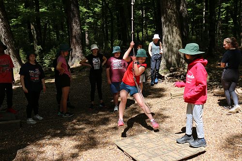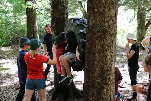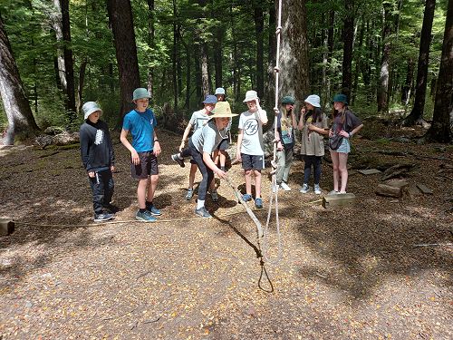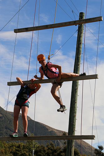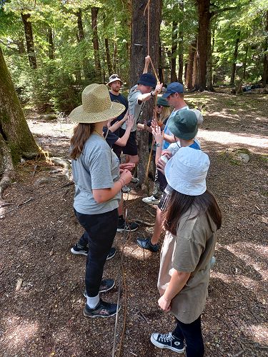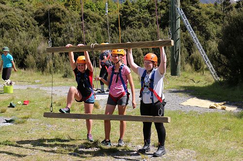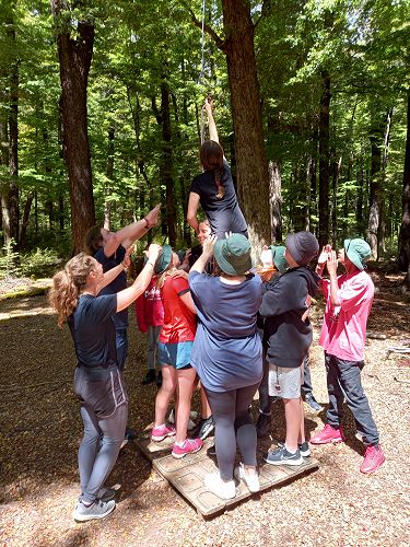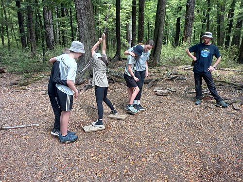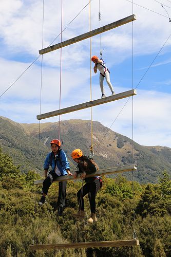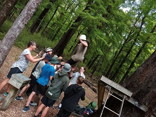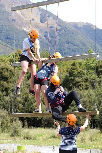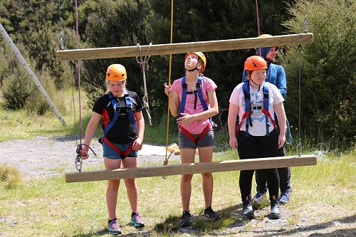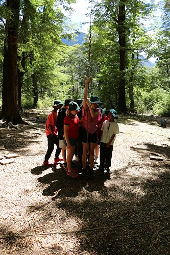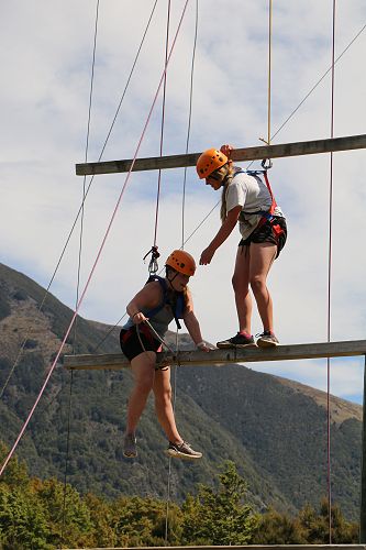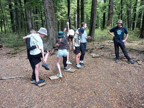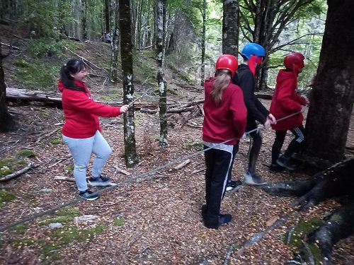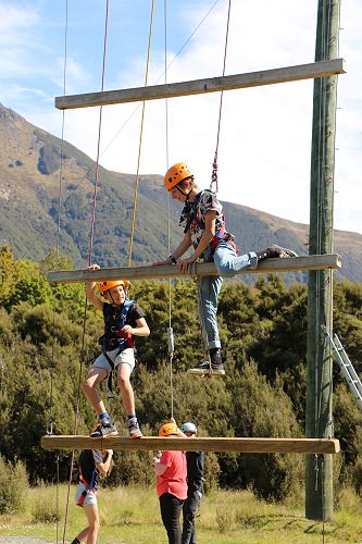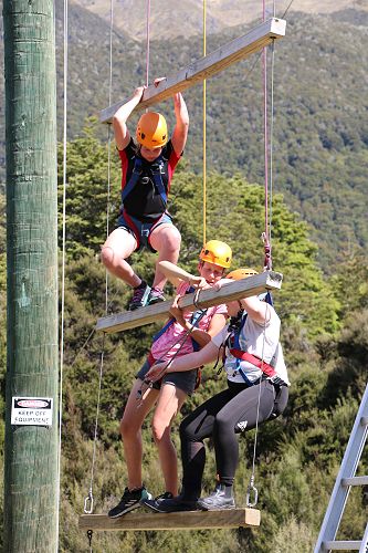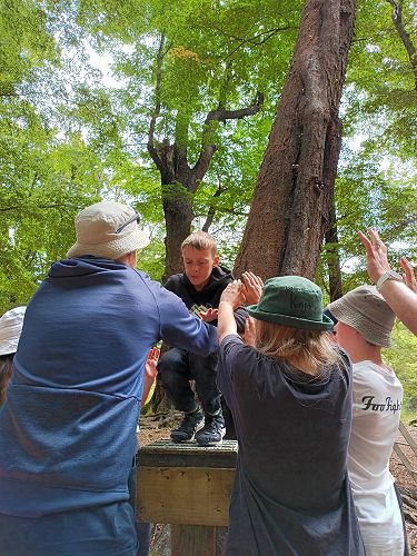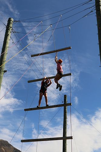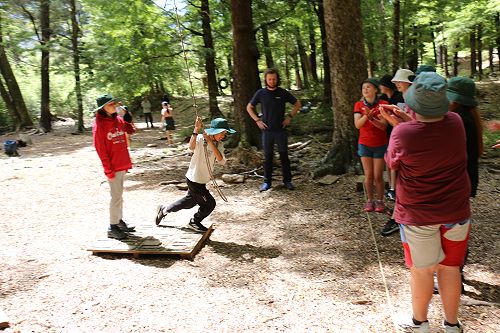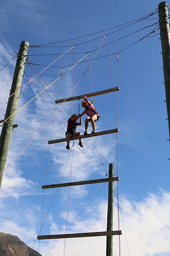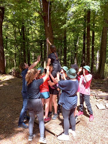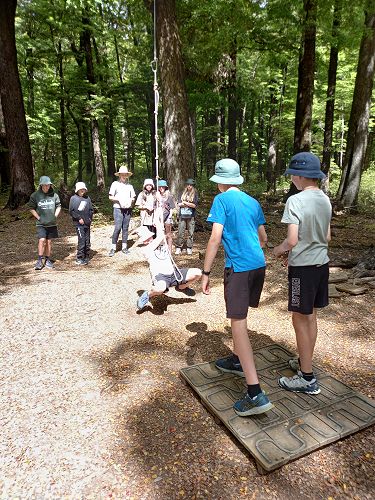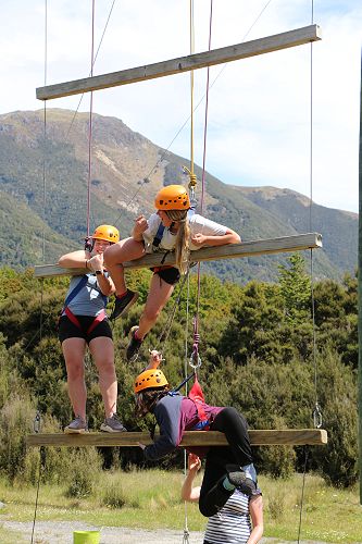 The low ropes were a set of team building challenges. The students had to work together to achieve getting across different distances using ropes, planks and themselves.