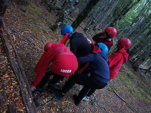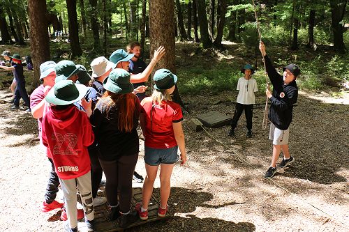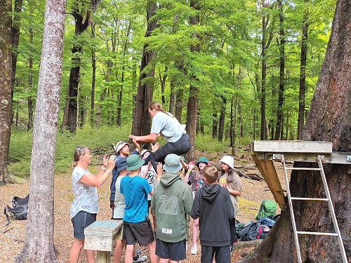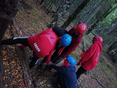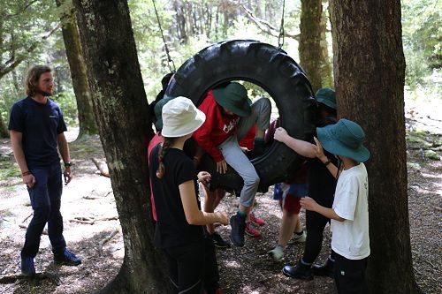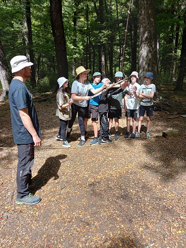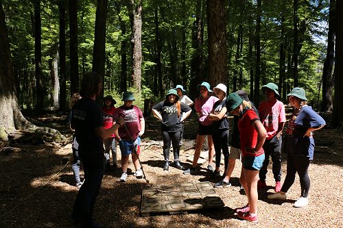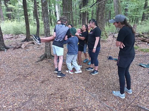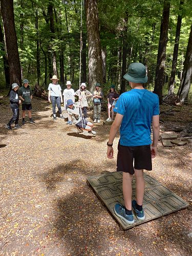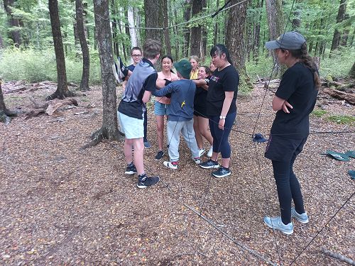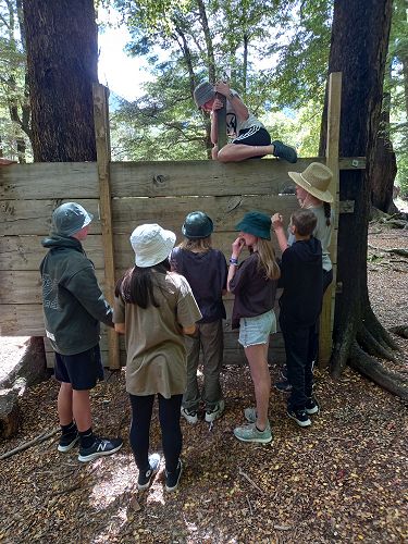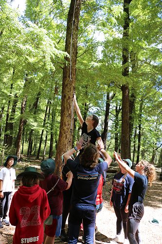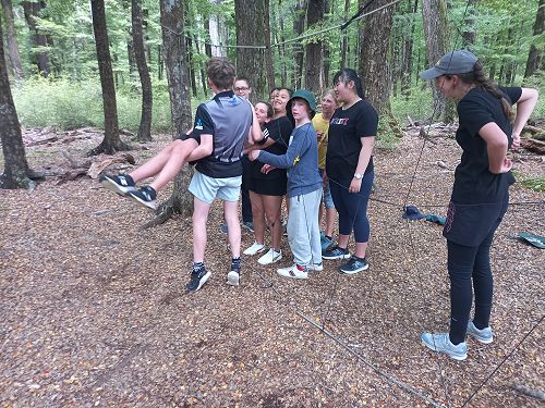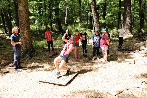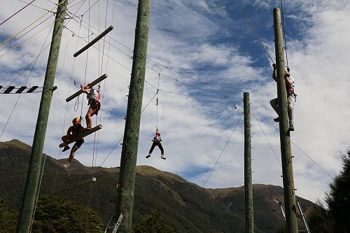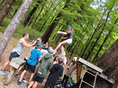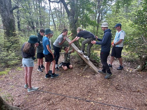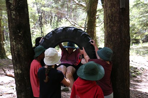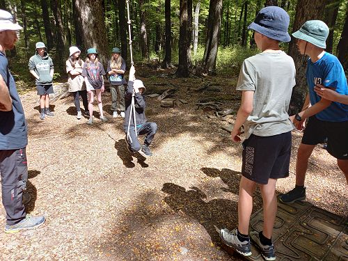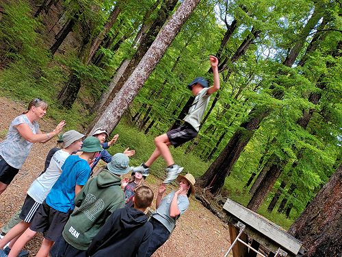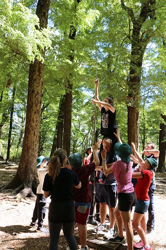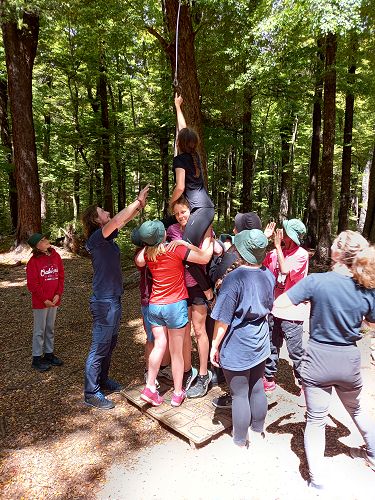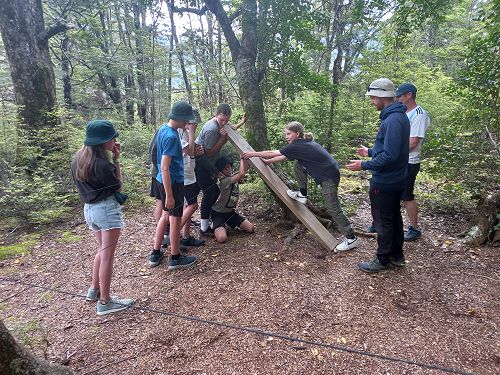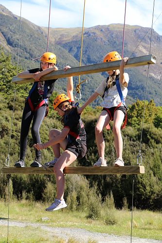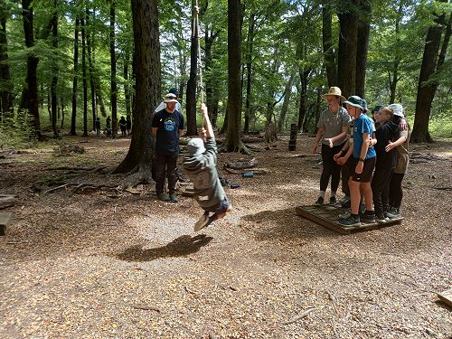 The low ropes were a set of team building challenges. The students had to work together to achieve getting across different distances using ropes, planks and themselves.