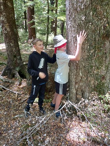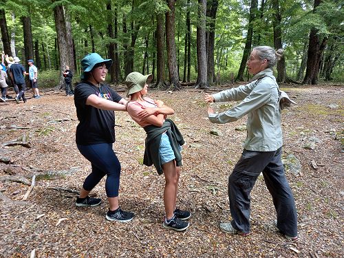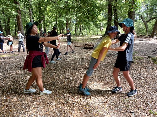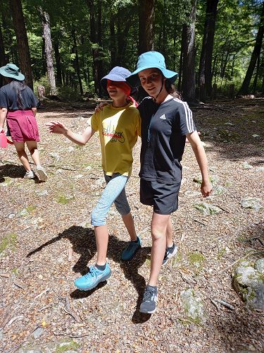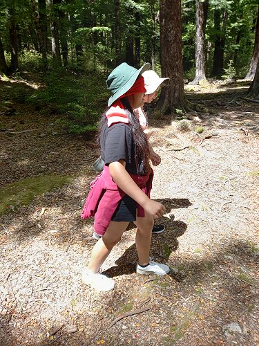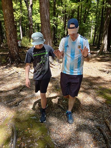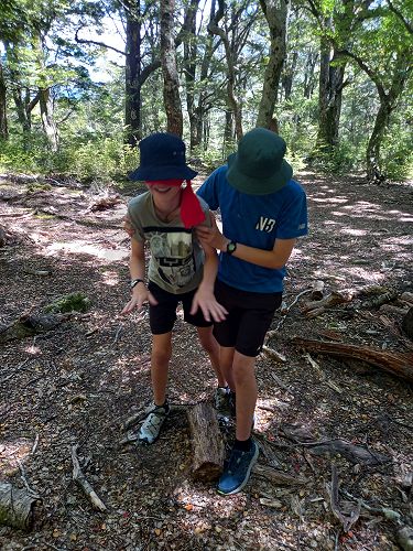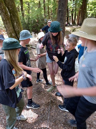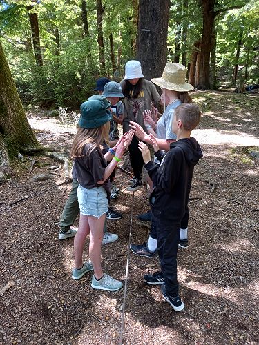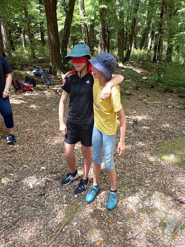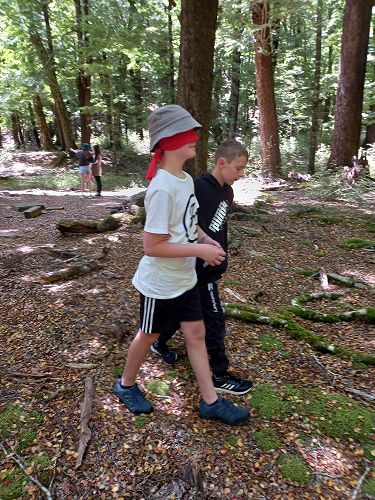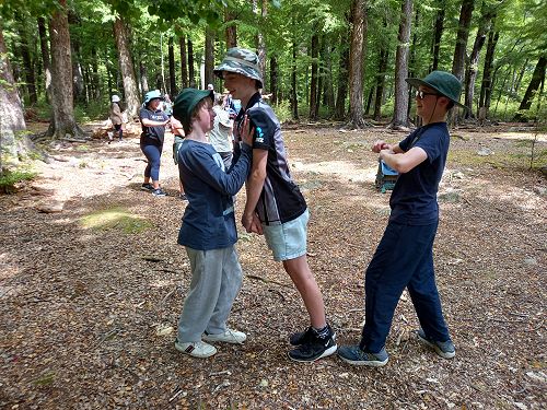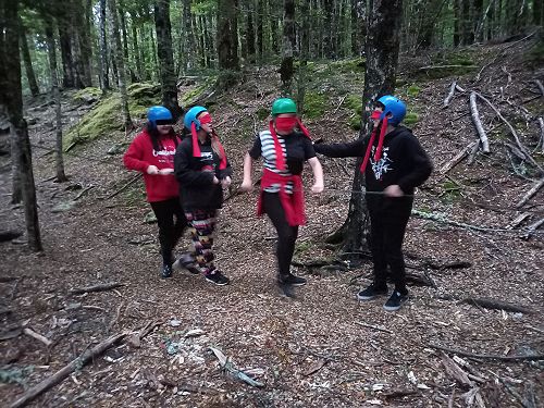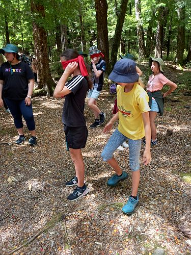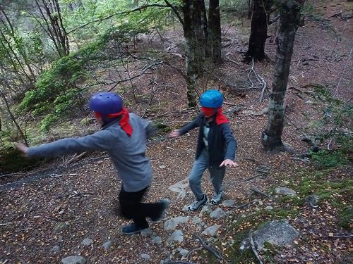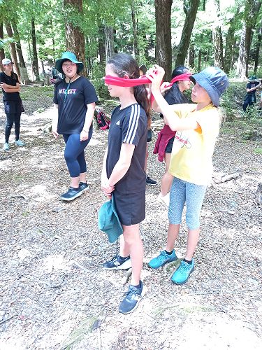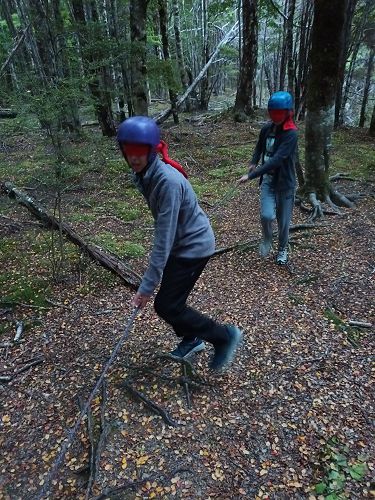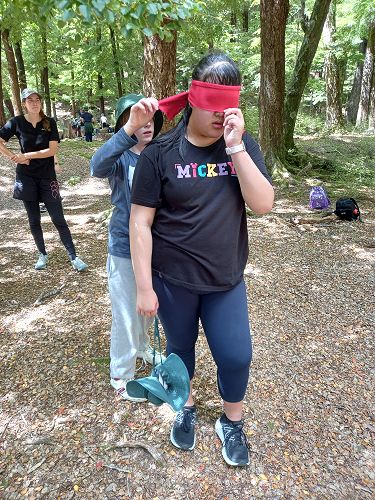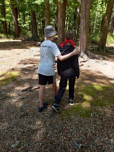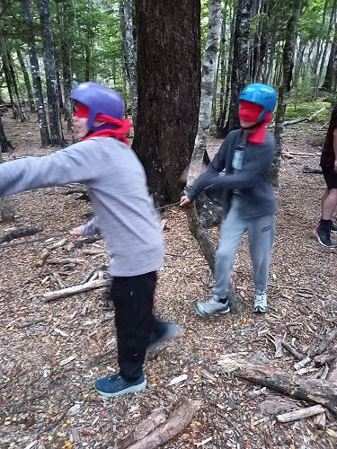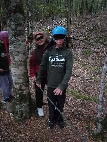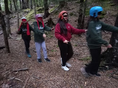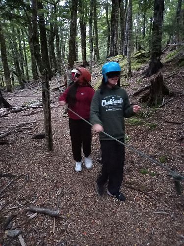 The students put helmets on and were blindfolded. Then set off down the rope line. The students had to talk to each other in their groups as the rope line changed directions, went under logs and around rocks.