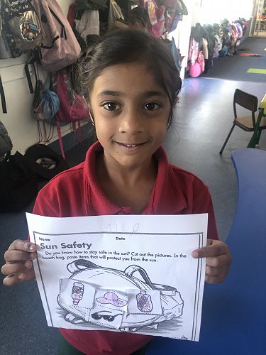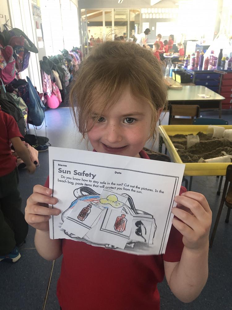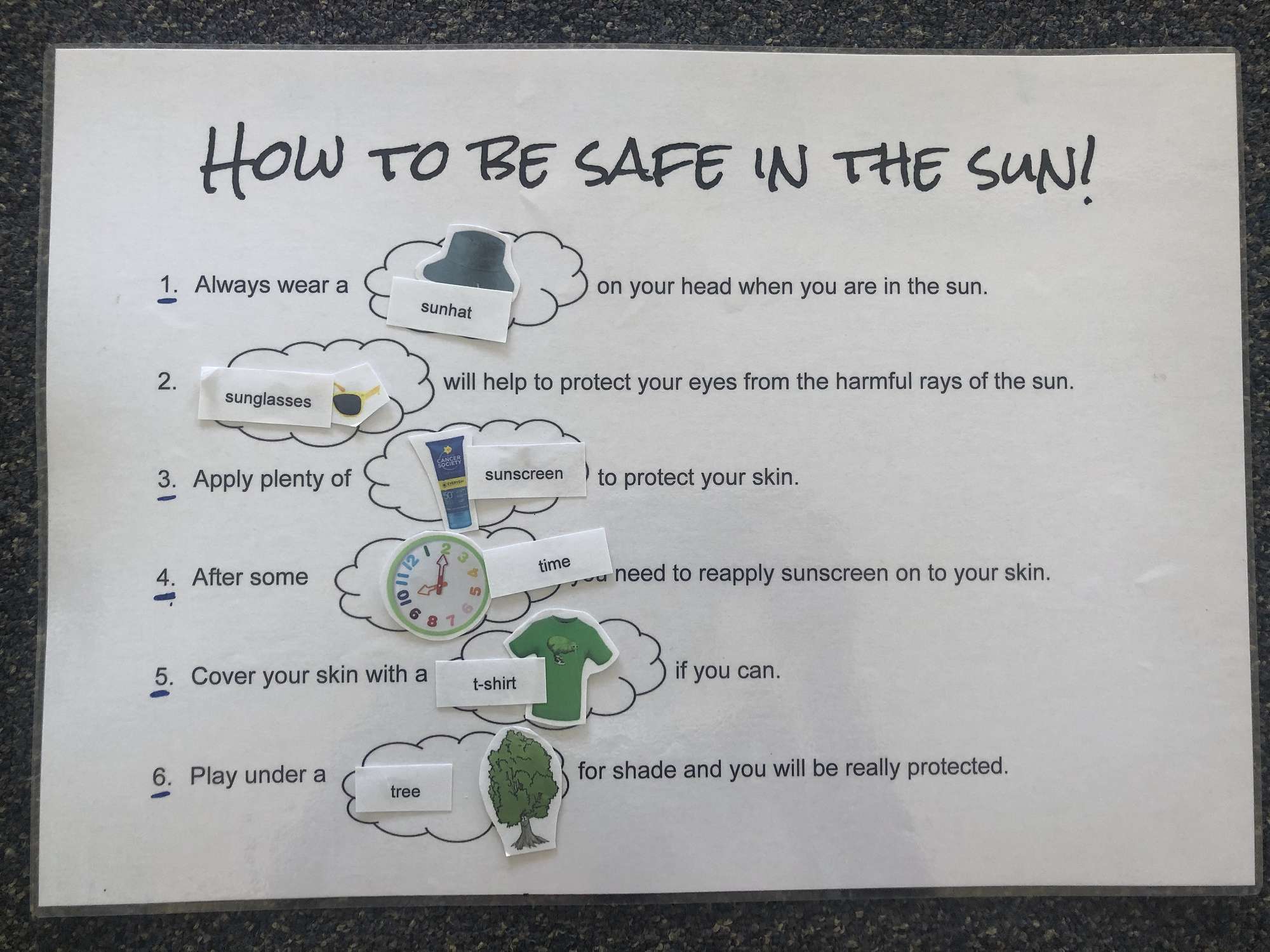 The children have also been learning about how to be safe in the sun! They have completed a cut and paste activity which worked on developed their cutting and fine motor skills. The children had to identify which items they would pack into their bag that would keep them sun safe. We also have an interactive poster where the children can make sentences about being sun safe.