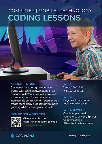 Learn coding, a valuable skill in our increasingly digital world! Years 5 & 6, 7 & 8, 9 & 10 - Week days after school. Attend online from home. Sign up for a FREE TRIAL by scanning the QR Code or codingnz.com.