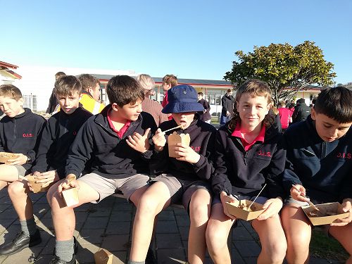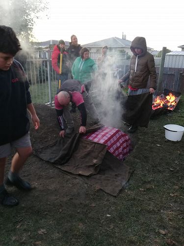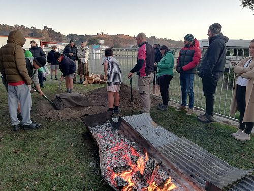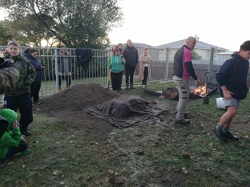 At 6am on Tuesday 21st June - the dawning of Matariki and the beginning of the Winter Solstice there were a group of hardy souls gathered in the gardens at Oamaru Intermediate, ready to ring in the Maori New Year, in style. The hangi pit had been dug and the vegetables chopped the previous day.