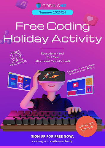 Coding NZ is running its free coding holiday activities again this summer. We thought you might want to share this opportunity with your school community, so have attached a flyer in a few different formats for email newsletter or Facebook sharing. Feel free to let us know if you need the flyer in a different format.