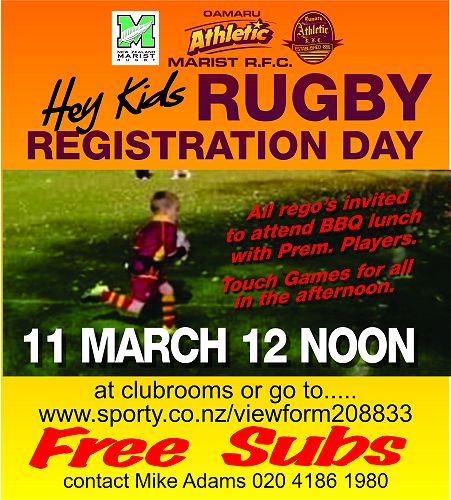 Athletic Marist R.F.C. Kids Registration Day Sunday 11 March at 12noon at the clubrooms or go to www.sporty.co.nz/viewform208833 - (Free Subs) All rego's invited to attend BBQ lunch with Prem players. Touch games for all in the afternoon. Contact Mike Adam on 02041861980. See poster attached.