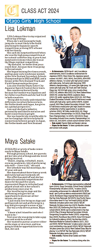 Congratulations to our Class Act recipients, Lisa Lokman and Maya Satake. Each year, the Otago Daily Times Class Act Awards recognise outstanding young talent across the southern region, with high schools nominating students for this honour. Lisa and Maya were celebrated alongside other exceptional students at a special awards ceremony in Dunedin, where they received their Class Act certificates from the Prime Minister. Lisa excels in athletics, cross country, and Japanese, while Maya shines in volleyball, performing arts, and hip hop. We are so proud of these talented young leaders and look forward to all they will accomplish in the future!