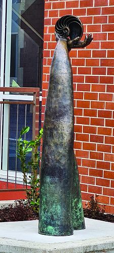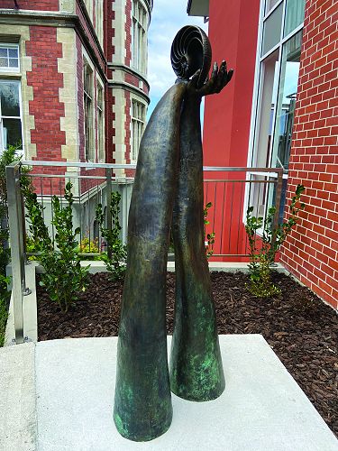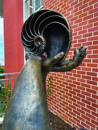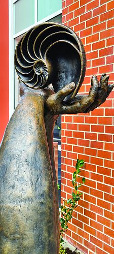 The Chambered Nautilus is the name of our school song which has been sung since 1936, and the shell has developed into our school symbol. The song is based on a poem of the same name by Oliver Wendall Holmes and was put to music by Roy Spackman, our school music teacher in 1935. The song is about growth, expansion and renewal. The sculpture "The Chambered Nautilus" is also about aspiration - the upward reach of the arms and the hands cradling the precious nautilus shell, with its symbolism of our potential . It offers the reassurance that we too are designed to grow precisely in our own time and in our own way, towards our own interior beauty.