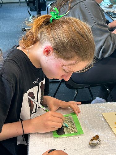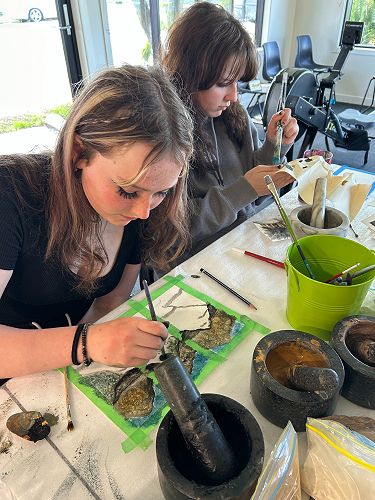 On Tuesday, we walked through mounds of native plants and sheep excretion for around two hours to get to the top of a mountain called Hereweka or the Harbour Cone. At the top, we learned of the story behind the mountain’s name and rested for a while before beginning the long trek back down to the van. At our classroom by the sea, we painted pictures using ground up rocks, which was followed by an art competition.