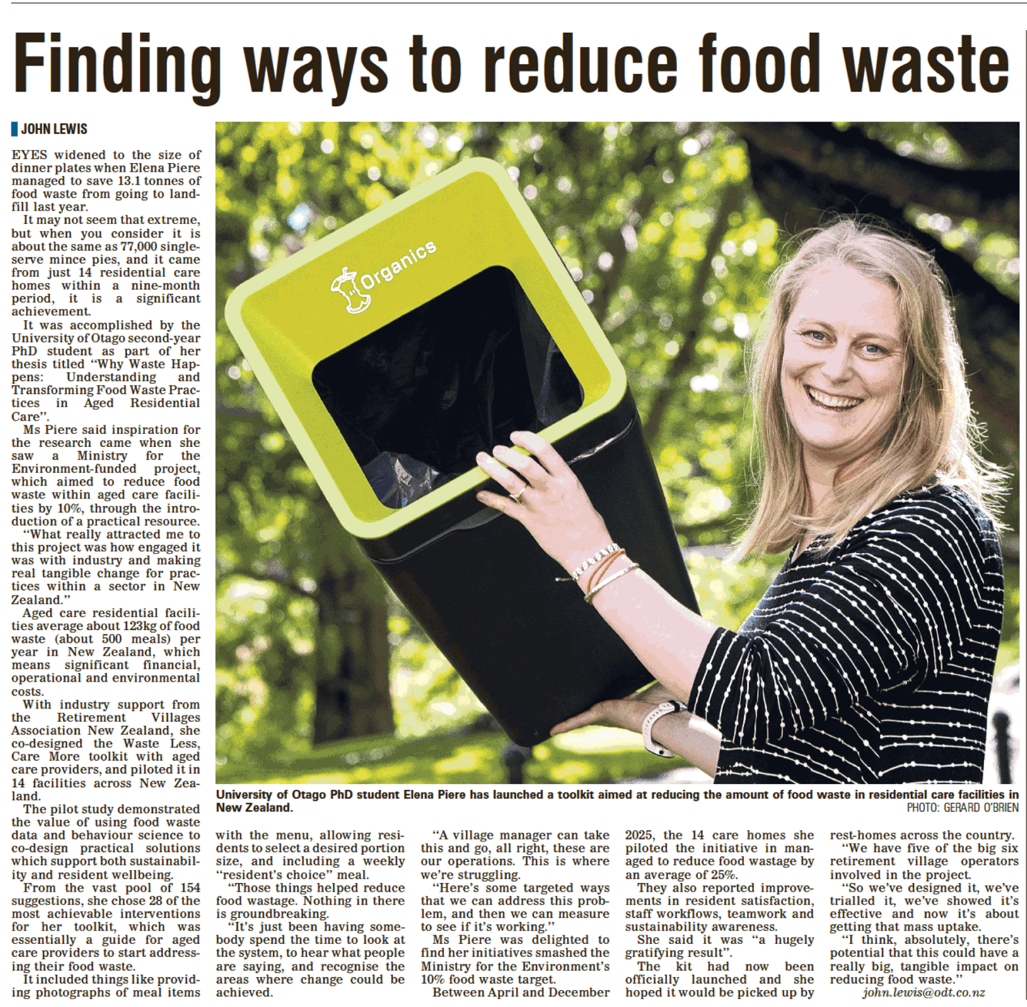 Now a PhD candidate at the University of Otago, Elena recently made headlines in the Otago Daily Times and University news for the launch of her "Waste Less, Care More" toolkit.
