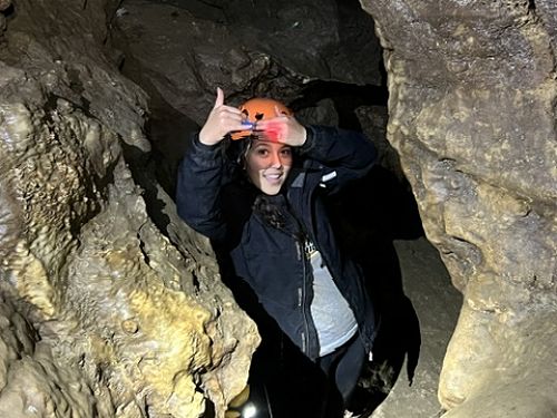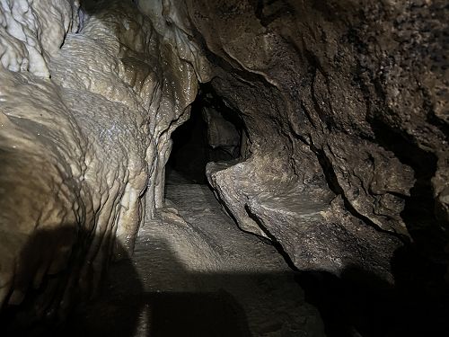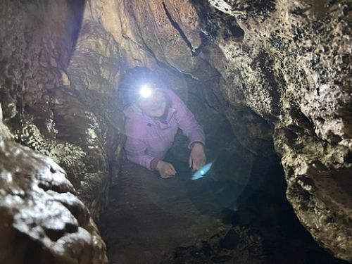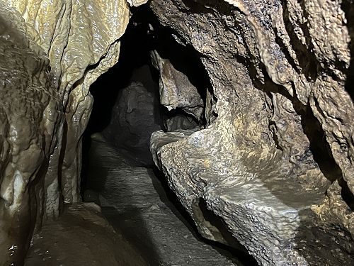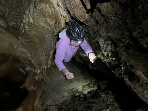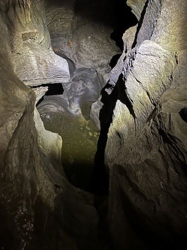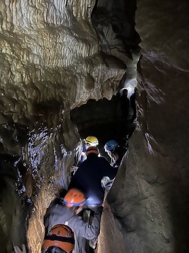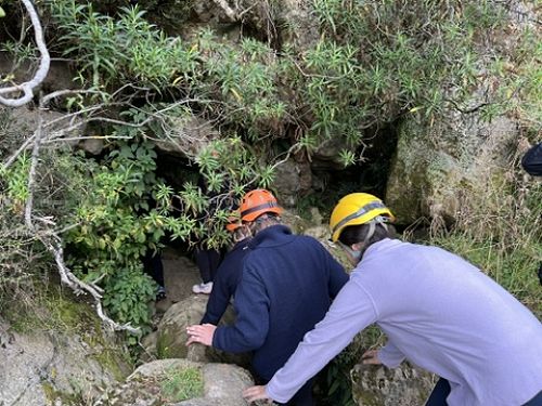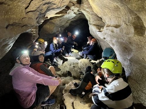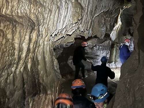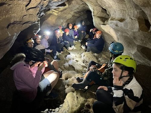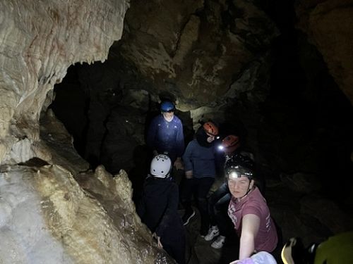 The darkness of the cave is complete. Darker than dark. But then, slowly, the glow worms come into view, shyly displaying their blue light to lure in the prey. But we are not afraid, because we are all together. We are a group of twelve students with an experienced instructor and confident teachers. It is not a silent cave either, for laughter and footsteps, and words of encouragement are always in our ears. And in what is for one afternoon only, The Chambered Nautilus is sung in a cabin in the depth of the Clifden Caves. With the verses still bouncing off the limestone stalactites, we turned on our torches and strode through the rest of the cave system.