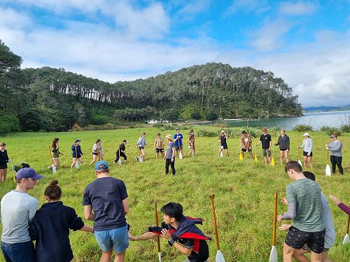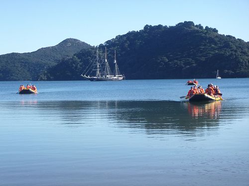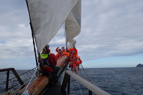 After our morning work was done, we would head off for an adventure in or around the place we were. Some of our expeditions included climbing to the top of the mast, toasting marshmallows around a camp fire, sailing the luggers (small boats), visiting offshore islands and swimming with dolphins. One particular highlight was the day when we had stopped at Great Barrier Island. Everyone paddled ashore in the rafts, ready to explore the island. We walked up to Mt Healed Hut (15 km return) in the hot sun surrounded by clear blue sky. Once at the top, there was an incredible view of the ocean stretching out forever. After arriving back to the ship, everyone was very warm from all the walking, so we went for a lovely evening swim off the side of the ship. Here we also used the rope swing to swing out and into the cool water, lots of fun.
