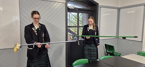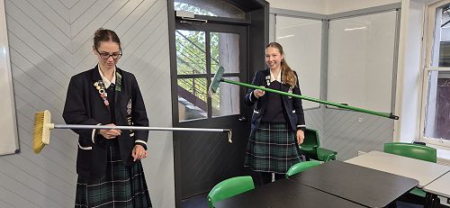 Year 13 students looking for the centre of mass of broomsticks and working on the motion of the centre of mass with the girl on the plank scenario.