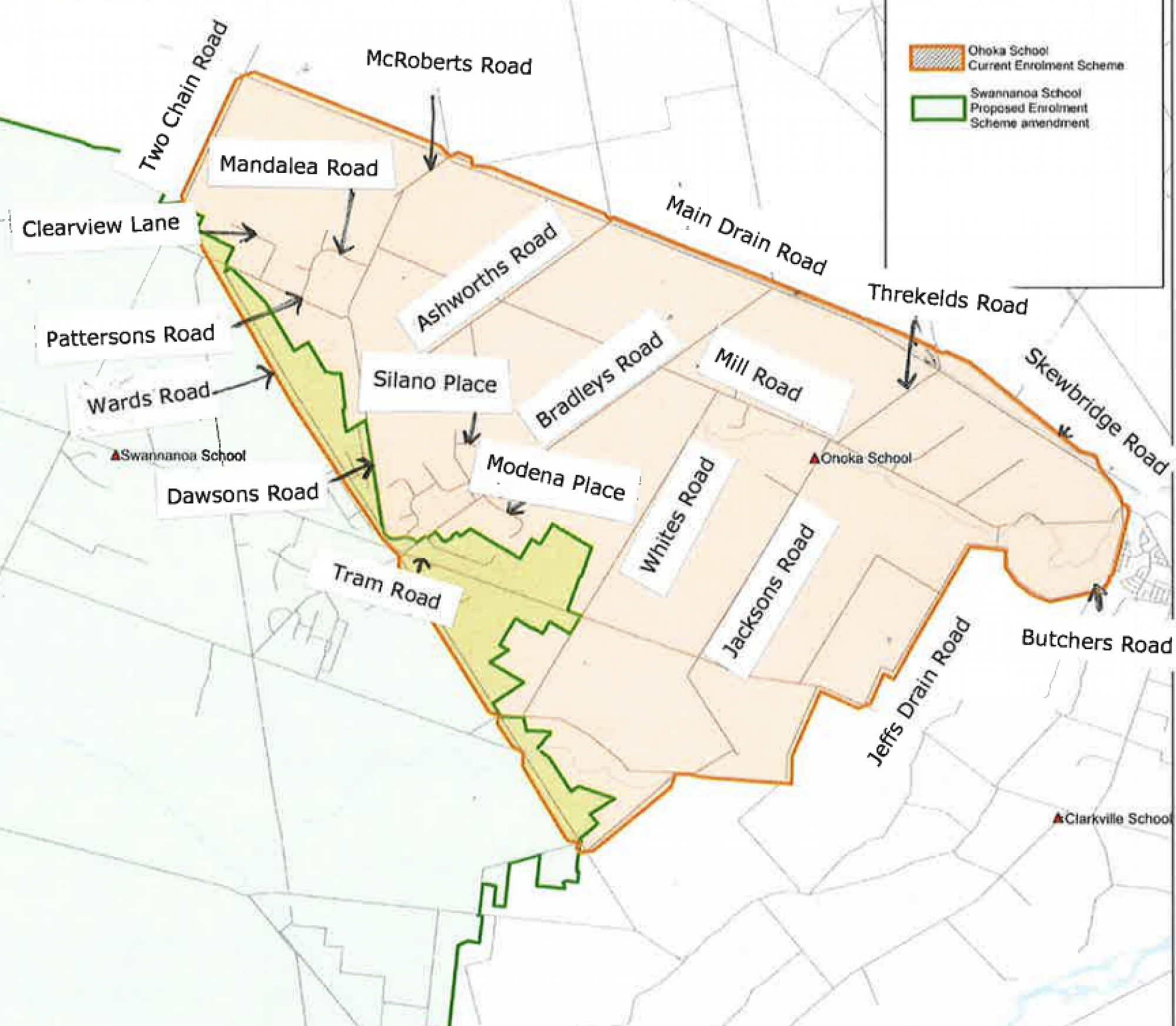 The Ōhoka School zone is as per the photo below. So long as your address is in the zone then you are automatically entitled to be enrolled. You can check if you are in zone by clicking this link https://www.educationcounts.govt.nz/find-school
