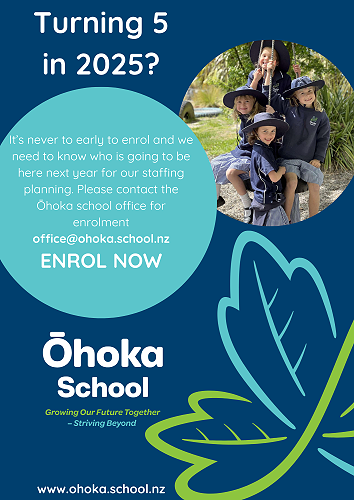 In Zone Students - To arrange for link to the online enrolment form to be sent to you please either email office@ohoka.school.nz or call the office on 03 312 6840.