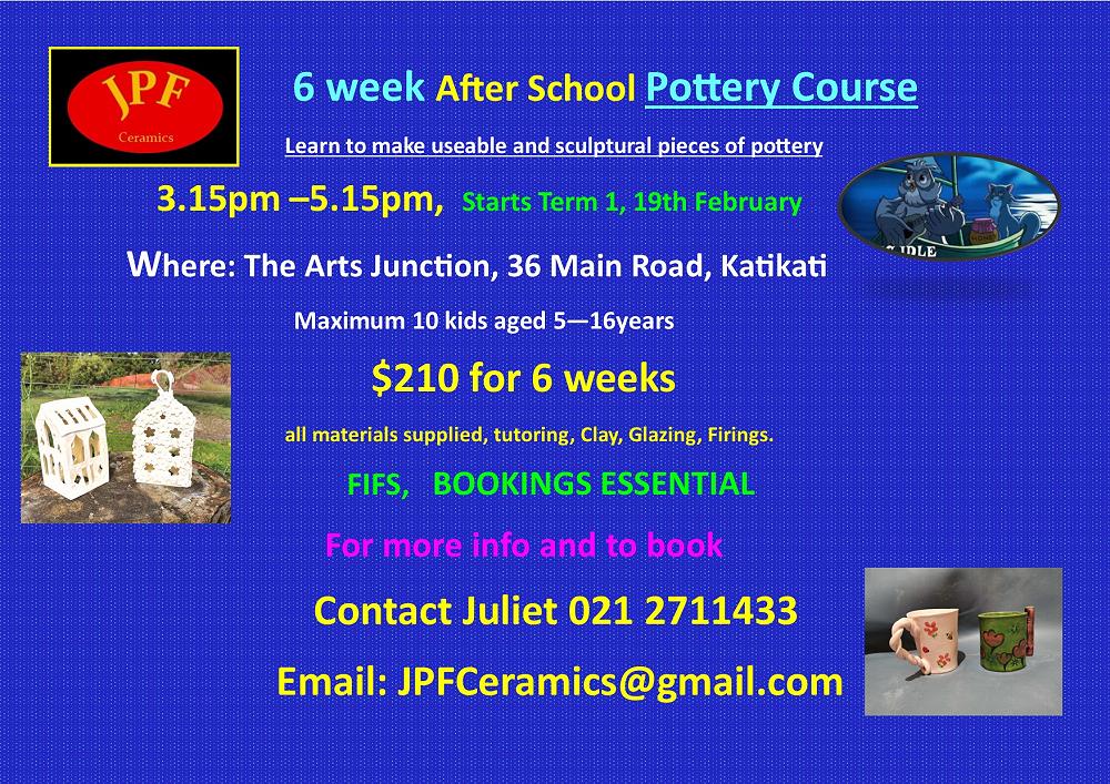 Starting this term on Monday 19th February I am holding a beginners/intermediate hand building pottery course at The Arts Centre, Katikati, 3.15pm - 5.15pm, it will be a minimum 6 kids enrolled and a maximum of 10 in the class, this enables one to one assistance/guidance if needed during class time, we will learn basic skills for the beginners and create some fabulous projects, for the intermediate potters we will have more challenging projects, at the end of the course we will have a mini Exhibition at The Arts Centre, to enable the child to gain the experience and recognition from family/friends for the great creative work that he/she has done.I will also hold a one off workshop at JPF Ceramics studio in Aongatete on Saturday 23rd March 10am -1pm, to Make a Silly, Cute, Funny Chook