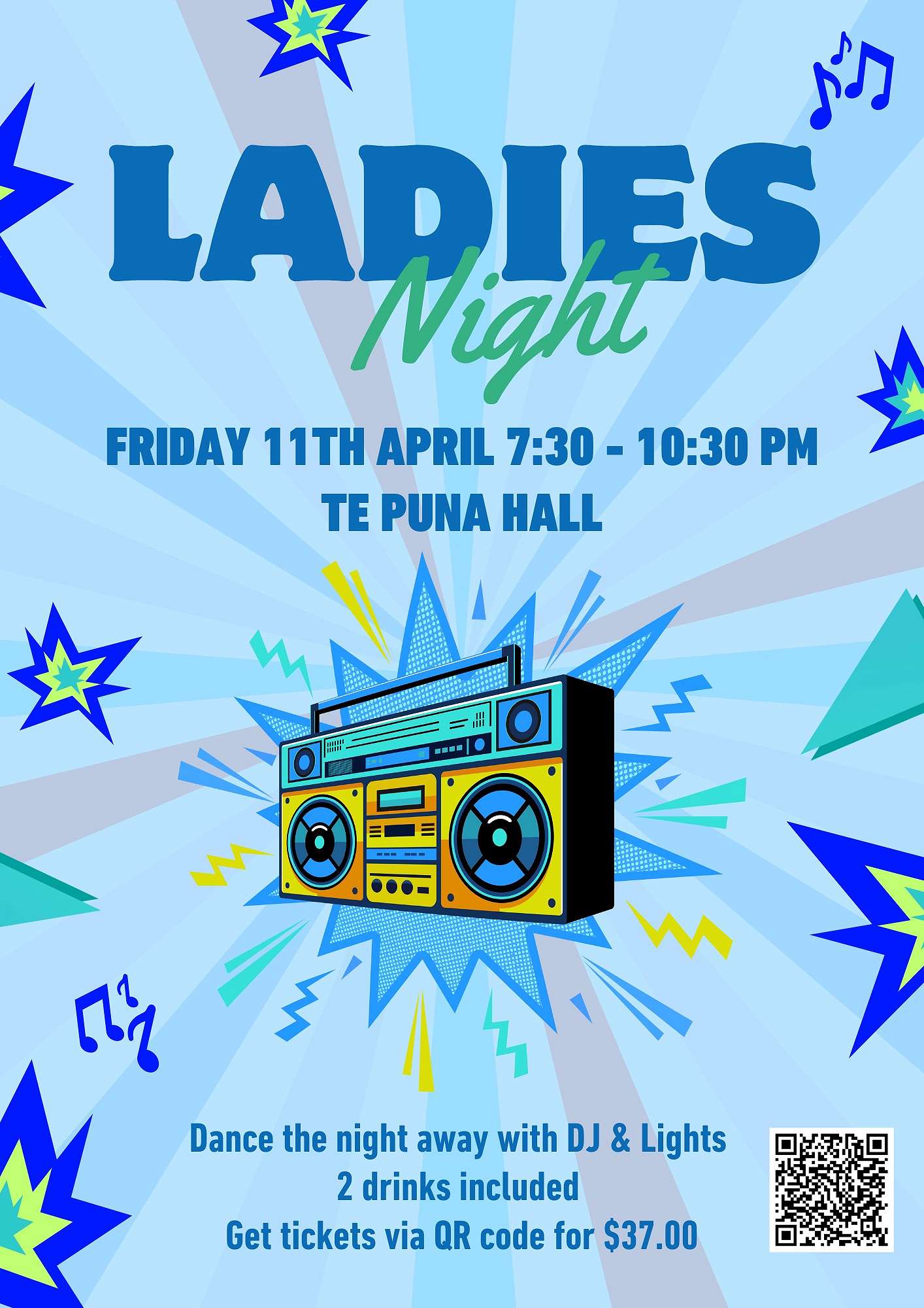Get ready for a night of fun, music, and movement at our Ladies Night Disco! Join us for 3 hours of non-stop dancing with DJ Aimee spinning all your favorite 90s and 2000s dance hits at Te Puna Hall. Your ticket includes 2 canned drinks (alcoholic or soft drink), so grab your friends, let your hair down, and hit the dance floor! It's your time to let loose, laugh, and dance the night away - because you deserve it! Terms & Conditions Ticket Policy: Your ticket grants entry to the Ladies Night Disco at Te Puna Hall on 11th April 2025. Each ticket includes two canned drinks (alcoholic or soft drink). Age Restrictions: This event is 18+ only. ID may be required for alcohol service. Refunds & Transfers: No refunds will be issued for change of mind or inability to attend. Tickets may be transferred to another person--please notify us in advance. Event Changes & Cancellations: If the event is cancelled, ticket holders will receive a full refund. If the event is rescheduled, tickets will be valid for the new date. Responsible Drinking Policy We encourage all guests to drink responsibly and be mindful of the venue and those around them. Intoxicated or disruptive behavior may result in removal from the event. For the safety and enjoyment of all attendees, bag checks will be conducted upon entry. Thank you for your cooperation. Liability & Safety: Attendees participate at their own risk. The organizers are not responsible for lost or stolen items, injury, or damages. By attending, you consent to event photography that may be used for promotional purposes. By purchasing a ticket, you agree to these terms. Now, let's dance the night away!