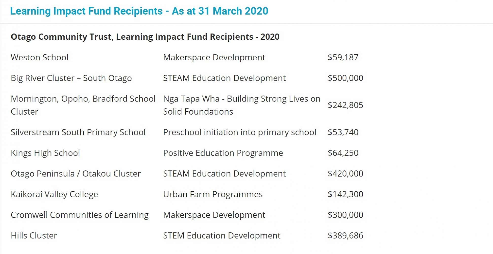 The Otago Community Trust established the Learning Impact Fund in 2017 to provide a dedicated fund to support projects which would make a real difference to student achievement, but which are unable to be funded through traditional funding channels. Since launching the Learning Impact Fund three years ago, Otago Community Trust has approved just over $2 million to eight separate Learning Impact Fund projects.