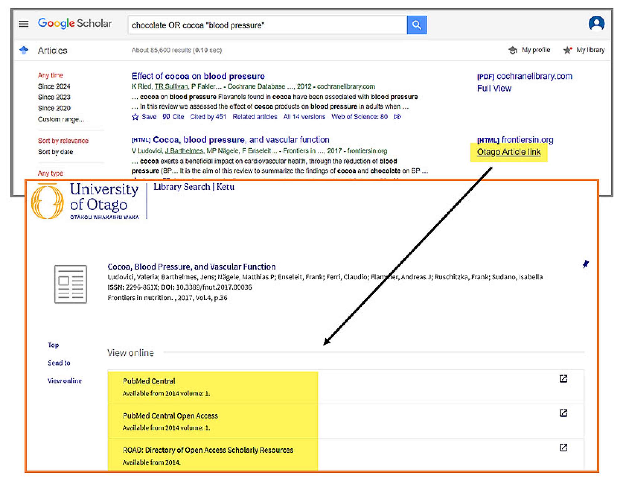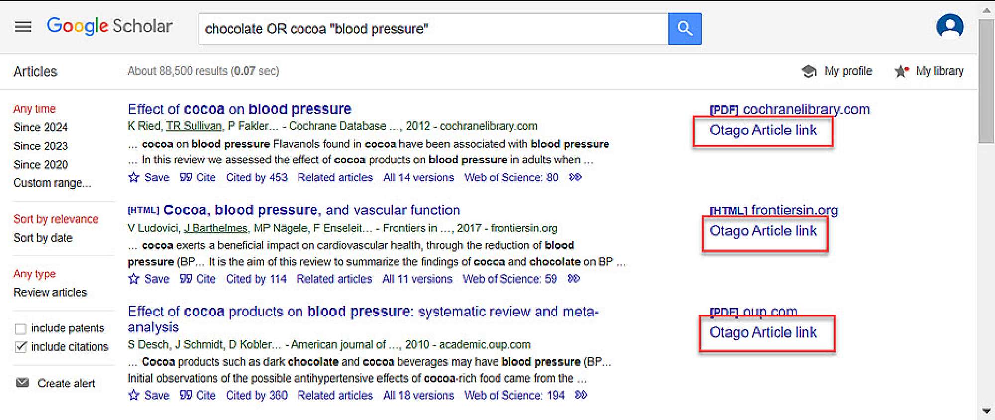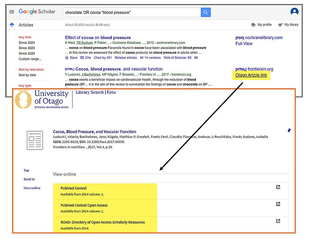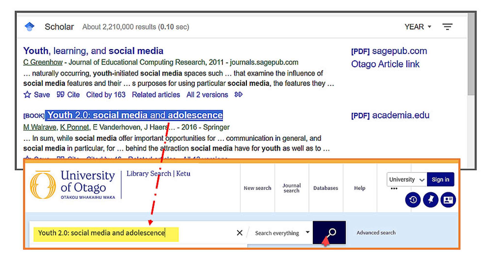The Google Scholar link on the Library website will prompt you to sign in with your student/staff username and password. After that, you will be able to see which Google Scholar results are available through the University’s database and e-journal subscriptions. Look out for: Otago Article Link, Wellington Article Link or Christchurch Article Link (as shown below).
