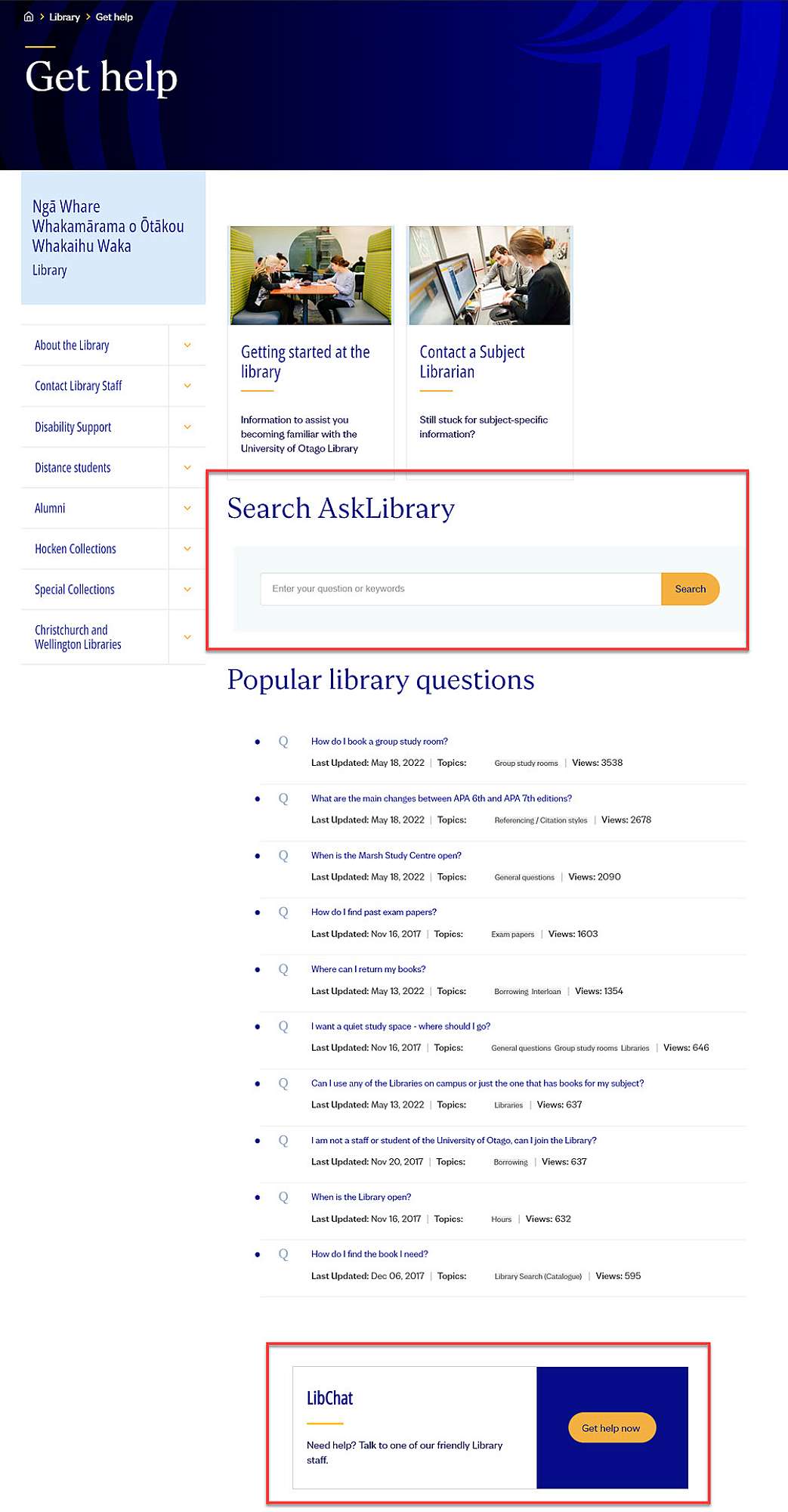 We have a bank of FAQs (AskLibrary) on the Get Help page. If we don't have the answer you need, please submit a question or contact us using LibChat at the bottom of the page.