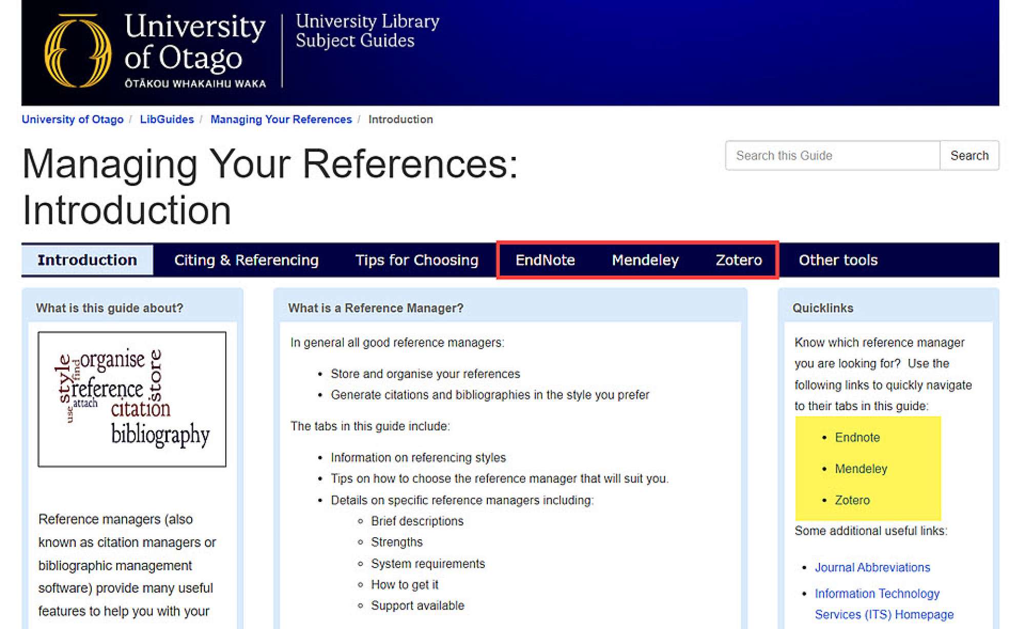 The Library has developed an online a Referencing Styles guide [otago.libguides.com/managingreferences]. The guide provides links to referencing manuals in the Library collection, referencing/citation style websites or blogs, pdf guides and interactive tutorials developed by various educational institutions. The following styles are covered: