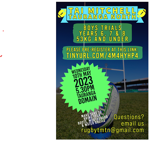 Calling all Year 6, Year 7 and Year 8 boys 53 kg and under to a second trial on Wednesday 10th May 2023 at 5:30 pm at Tauranga Domain. All are welcome even if you did not attend the first trial.