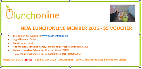 Please note that Lunchonline is offering a 'New Student Voucher' to any new students. Contact lunchonline and they will set up a lunchonline account with a $5 credit - see attached voucher.